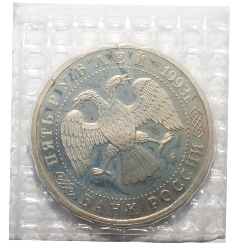Аверс: Вверху вдоль канта - номинал «Пять рублей» и год выпуска «1993 г.», внизу - слова «Банк России». В середине - двуглавый орел, под ним справа - монограмма монетного двора «ЛМД».