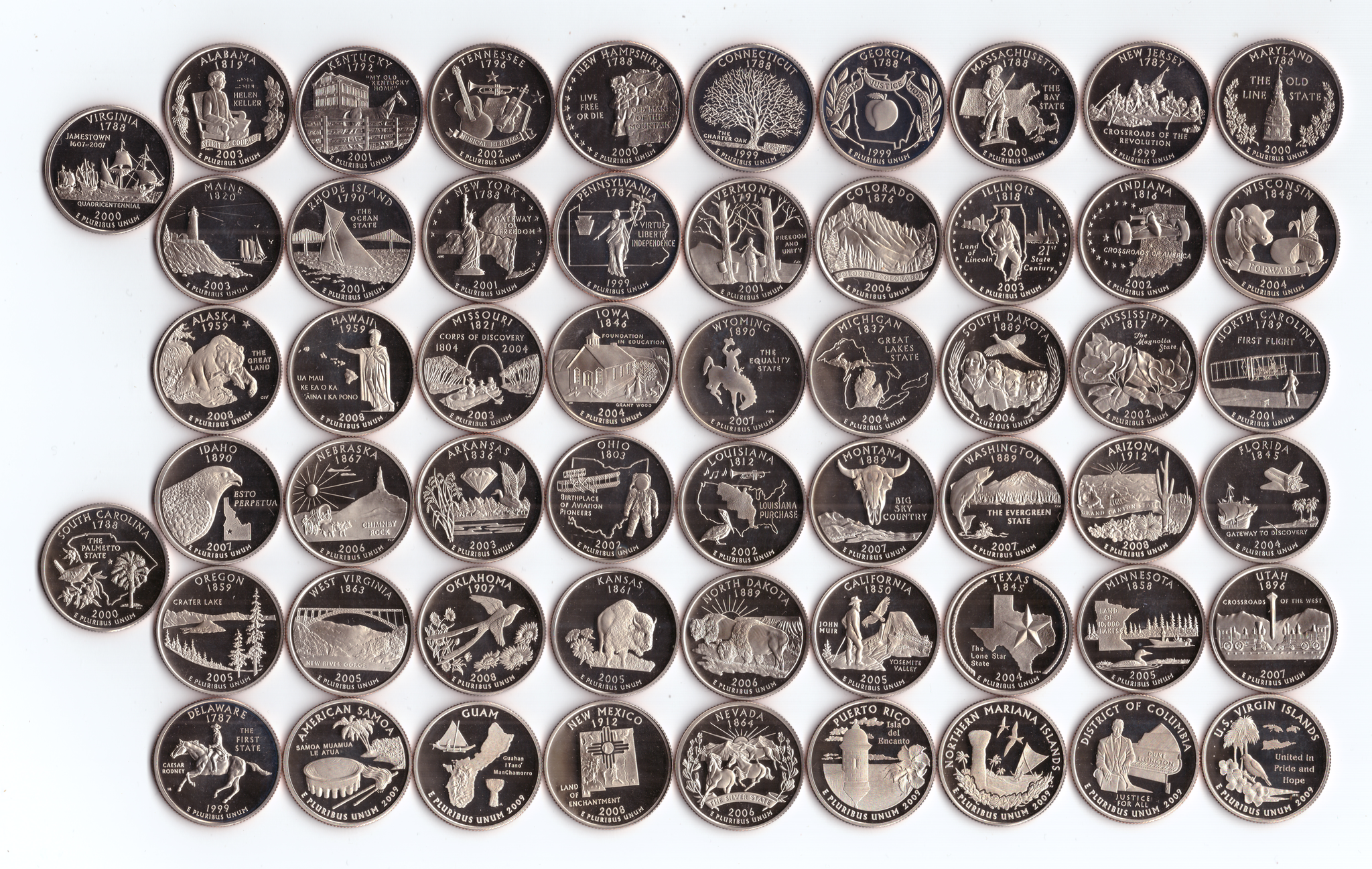 PROOF Набор "Штаты и Территории" квотеры 25 центов 56 штук 1999-2009 гг. Двор S улучшенный чекан
