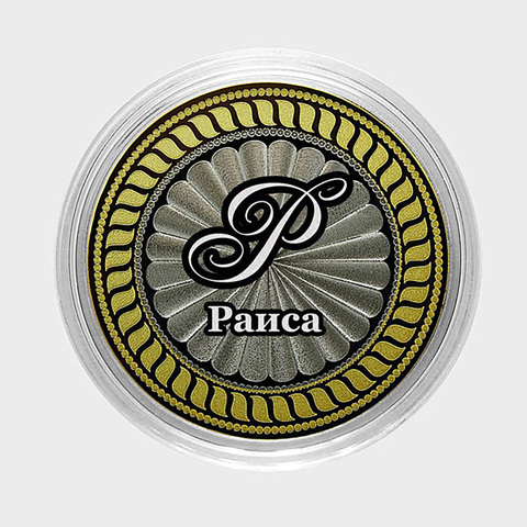 Сувенирная монета "Раиса" номиналом 10 рублей с выгравированным изображением.