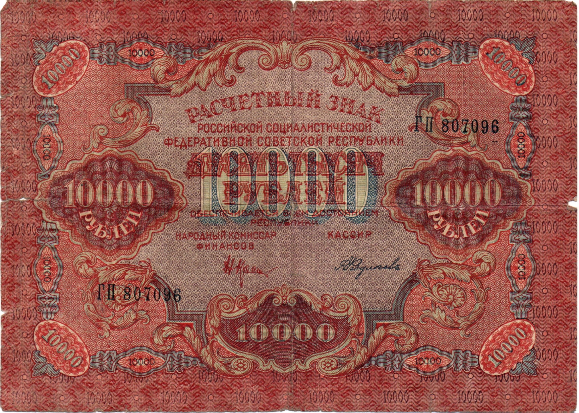 Расчетный знак 10000 рублей 1919 год - кассир Федулеев - ГП 807096 - РСФСР