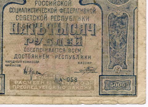 Расчетный знак 5000 рублей 1921 год. РСФСР. Кассир Порохов АА-058. VG