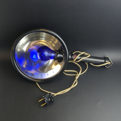Синяя лампа, рефлектор Минина – прибор для физиотерапевтического прогревания сухим теплом (инфракрасным излучением), изобретенный в 1891 году. Инфракрасные лучи проникают в ткани, вызывая прогревание, что способствует снятию воспалений, болевого синдрома и расслаблению мышц. Первоначально была разработана для лечения невралгии способом прогревания русским военным врачом А. В. Мининым. СССР Размеры: длина 36 см, диаметр 20,5 см. Потертости на корпусе.