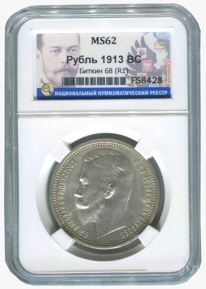 Рубль. Николай II. 1913 года (ВС) Редкий. В слабе ННР MS 62. Серебро. XF-AU