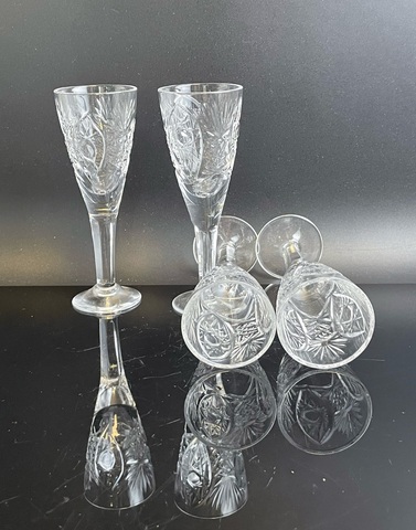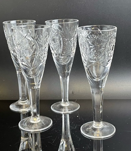 Рюмки хрустальные набор из 4 штук на высокой ножке, алмазная грань, геометрический орнамент, 12 см, 50 мл., винтаж СССР 1970-1990 гг. Присутствуют следы использования - состояние на фото