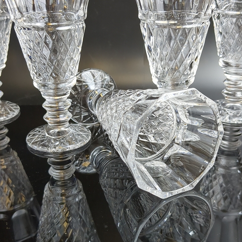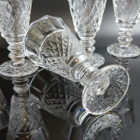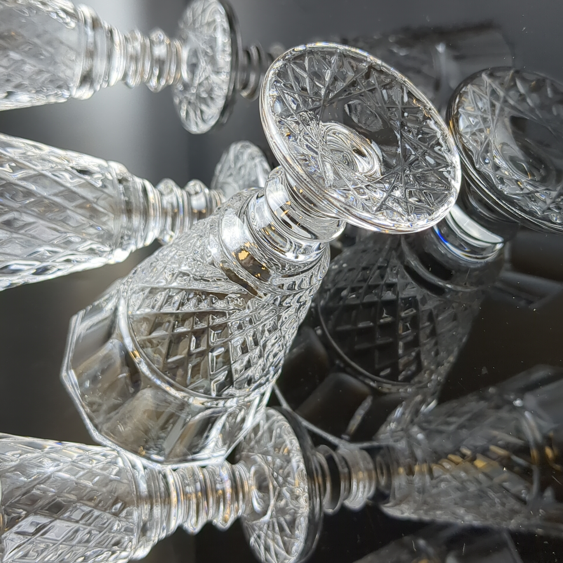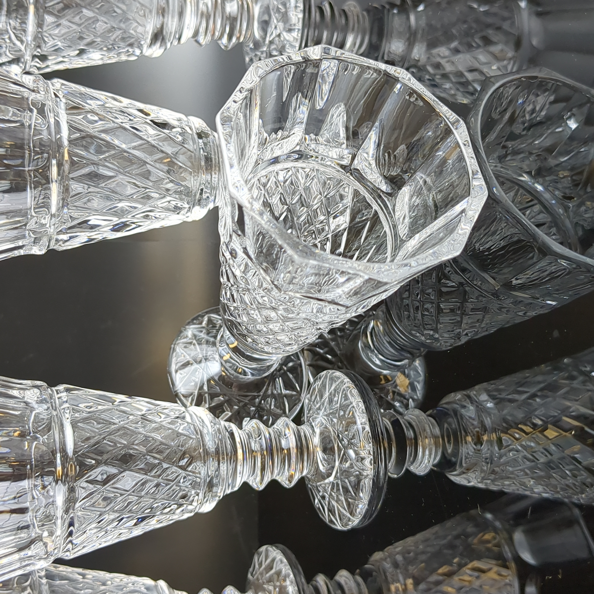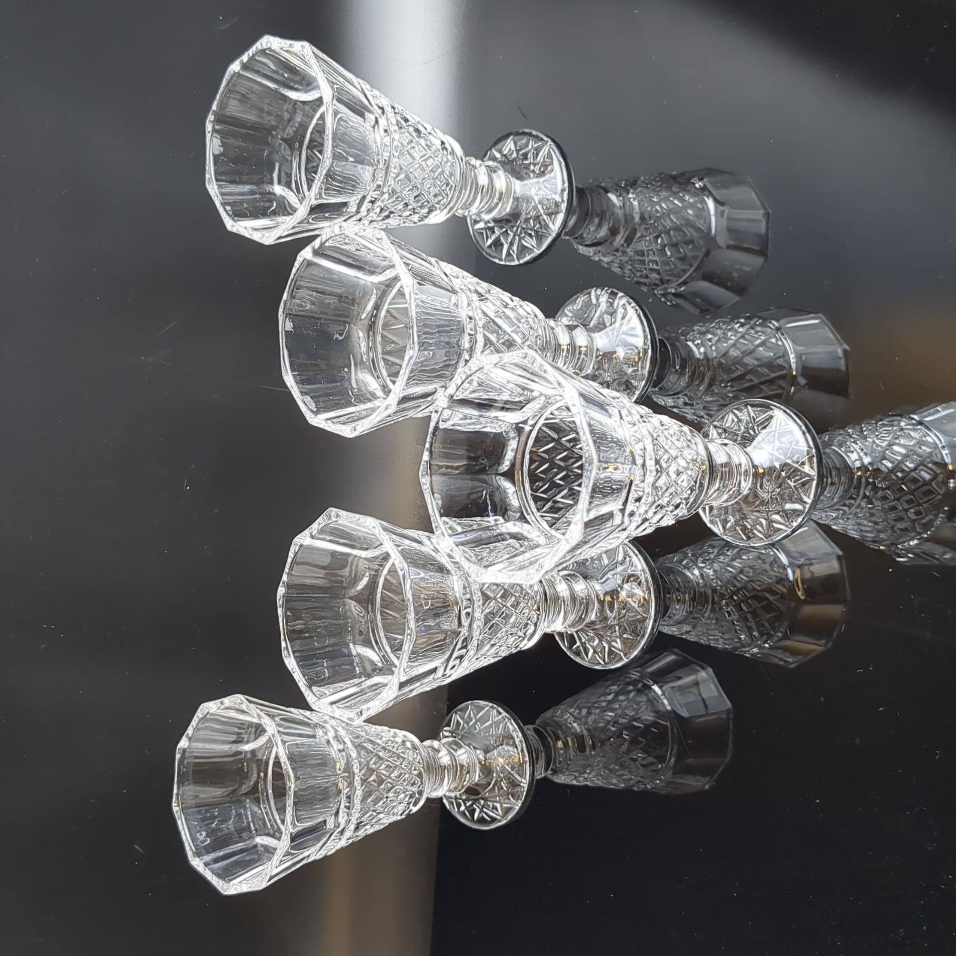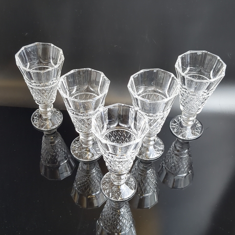 Рюмки лафитники хрустальные набор из 5 штук, алмазная грань, геометрический орнамент, высота - 11.5 см, винтаж СССР 1970-1990 гг. Изящный дизайн, идеально для сервировки праздничного стола.