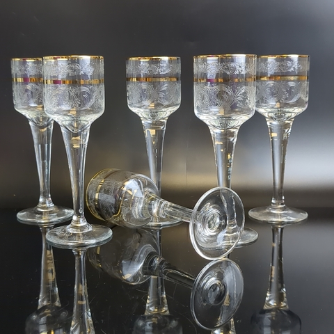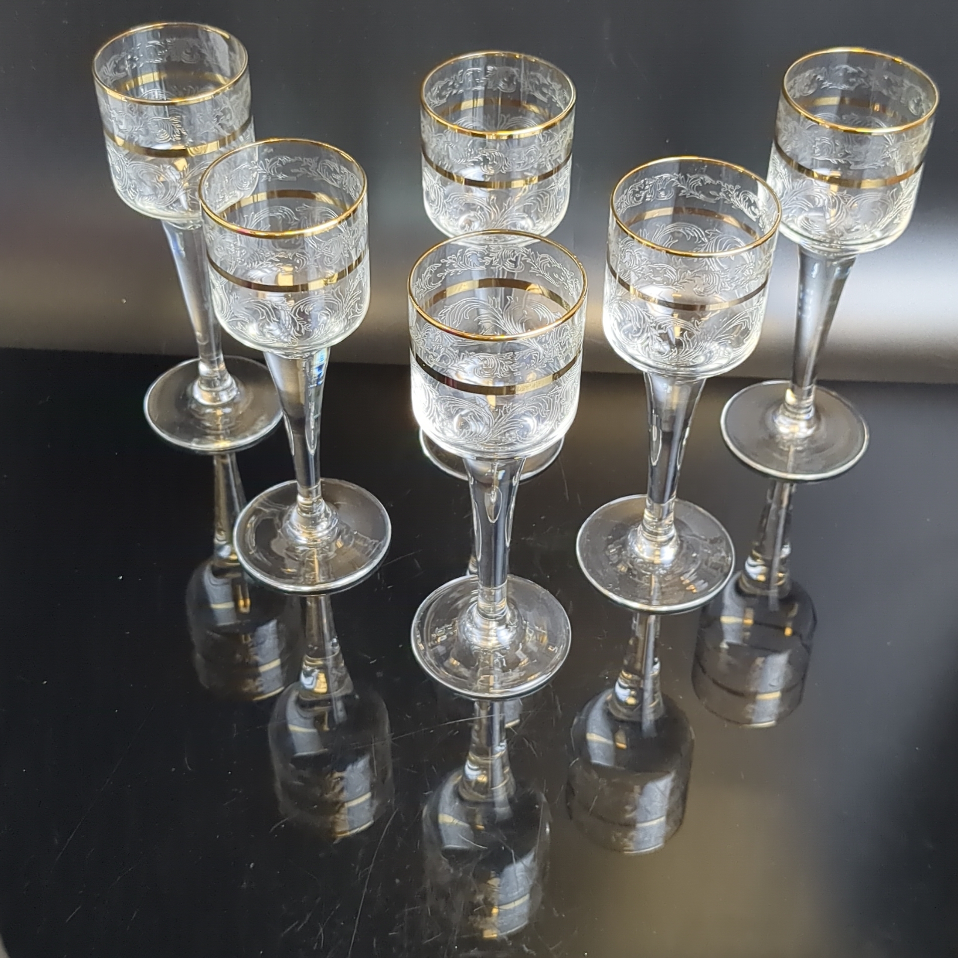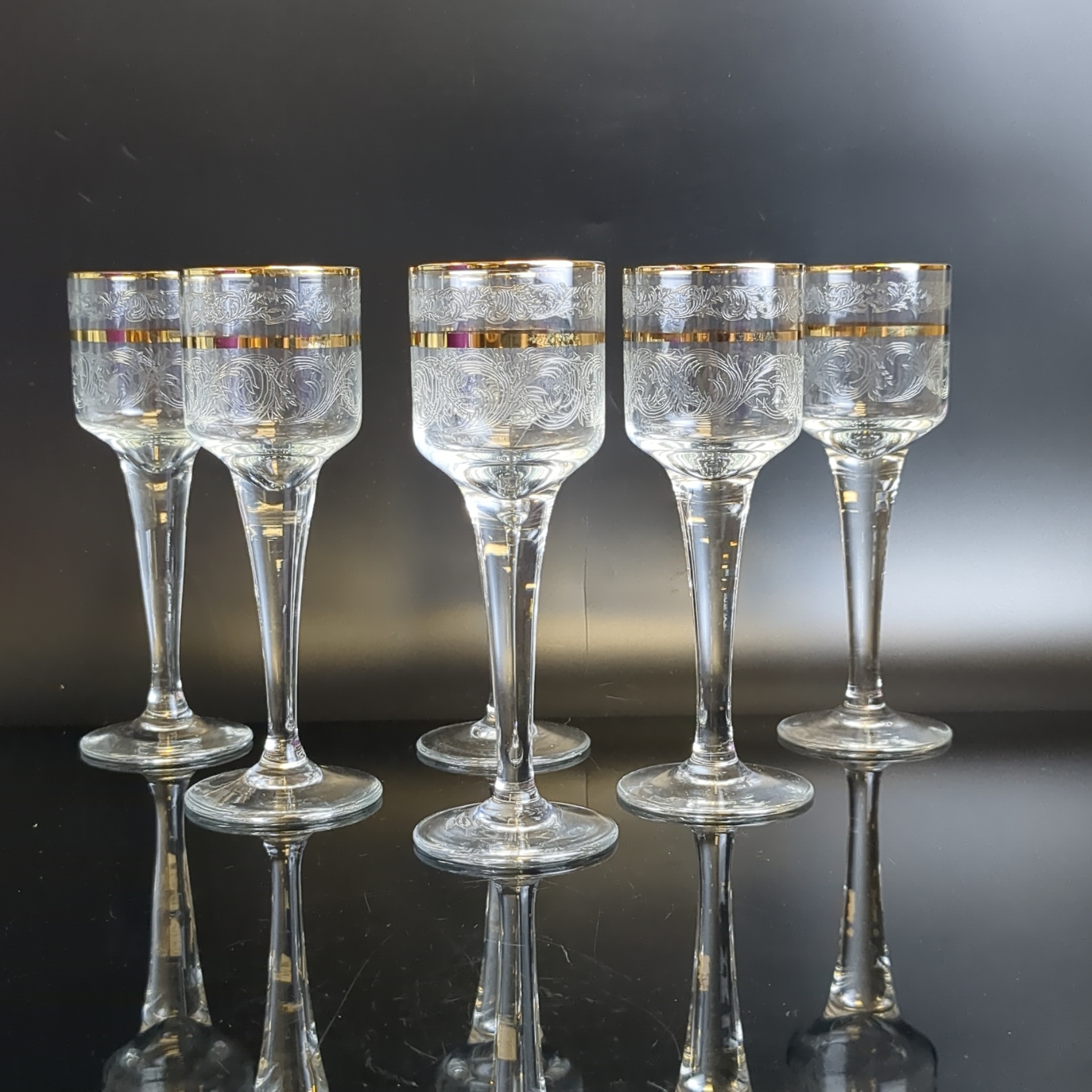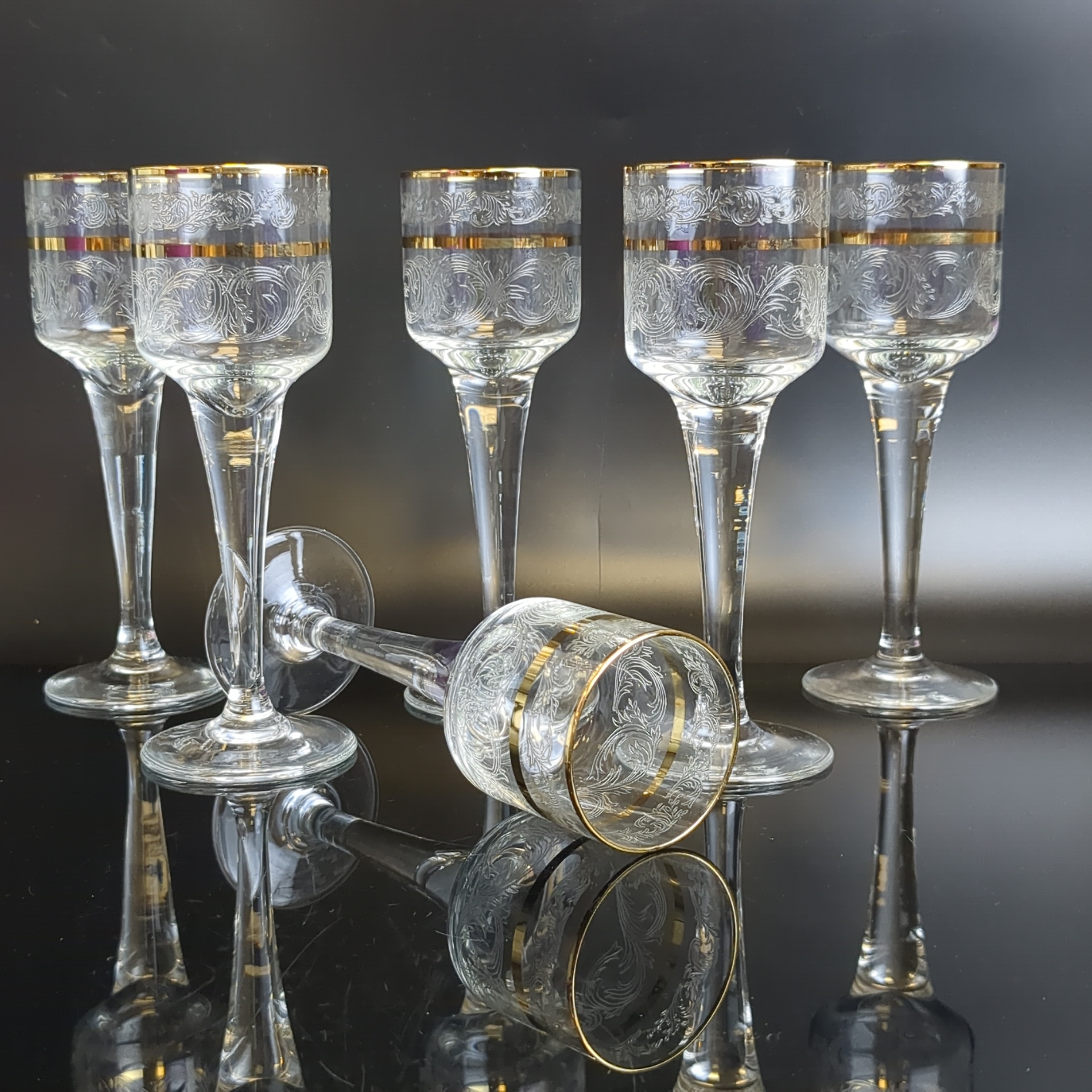 Коллекционный набор рюмок на изящной ножке из богемского хрусталя – стильный акцент вашего интерьера! Вдохновленный элегантной эстетикой времён СССР (1970–1990-е), он очарует любого изысканной алмазной огранкой, утончёнными золочёными завитками и благородным винтажным шармом. Прекрасно подойдёт как для праздничного застолья, так и станет украшением коллекции ценителей антиквариата и роскоши прошлого эпохи