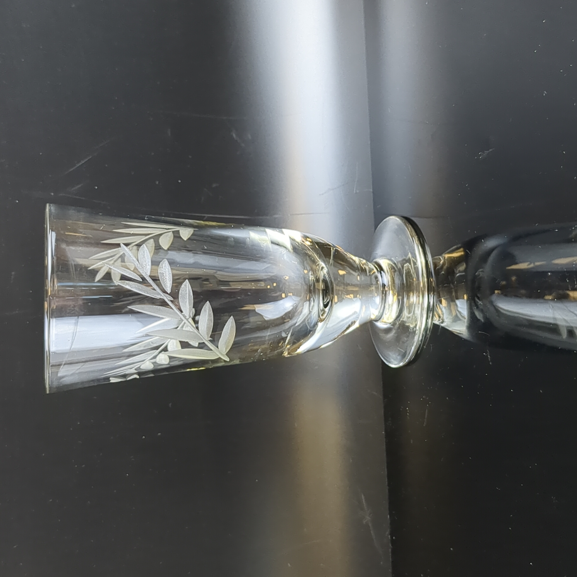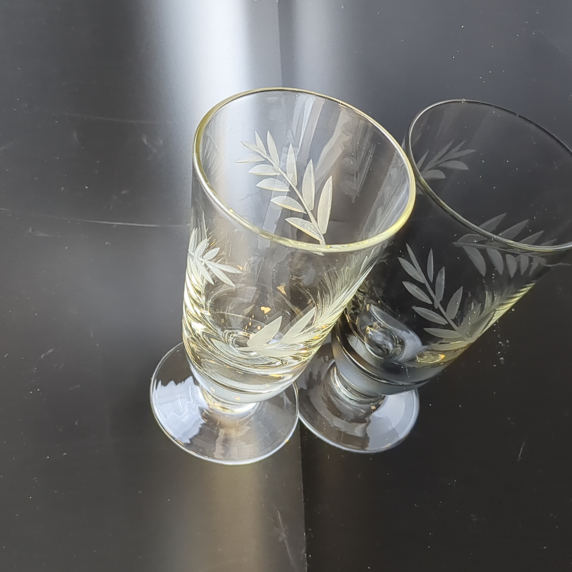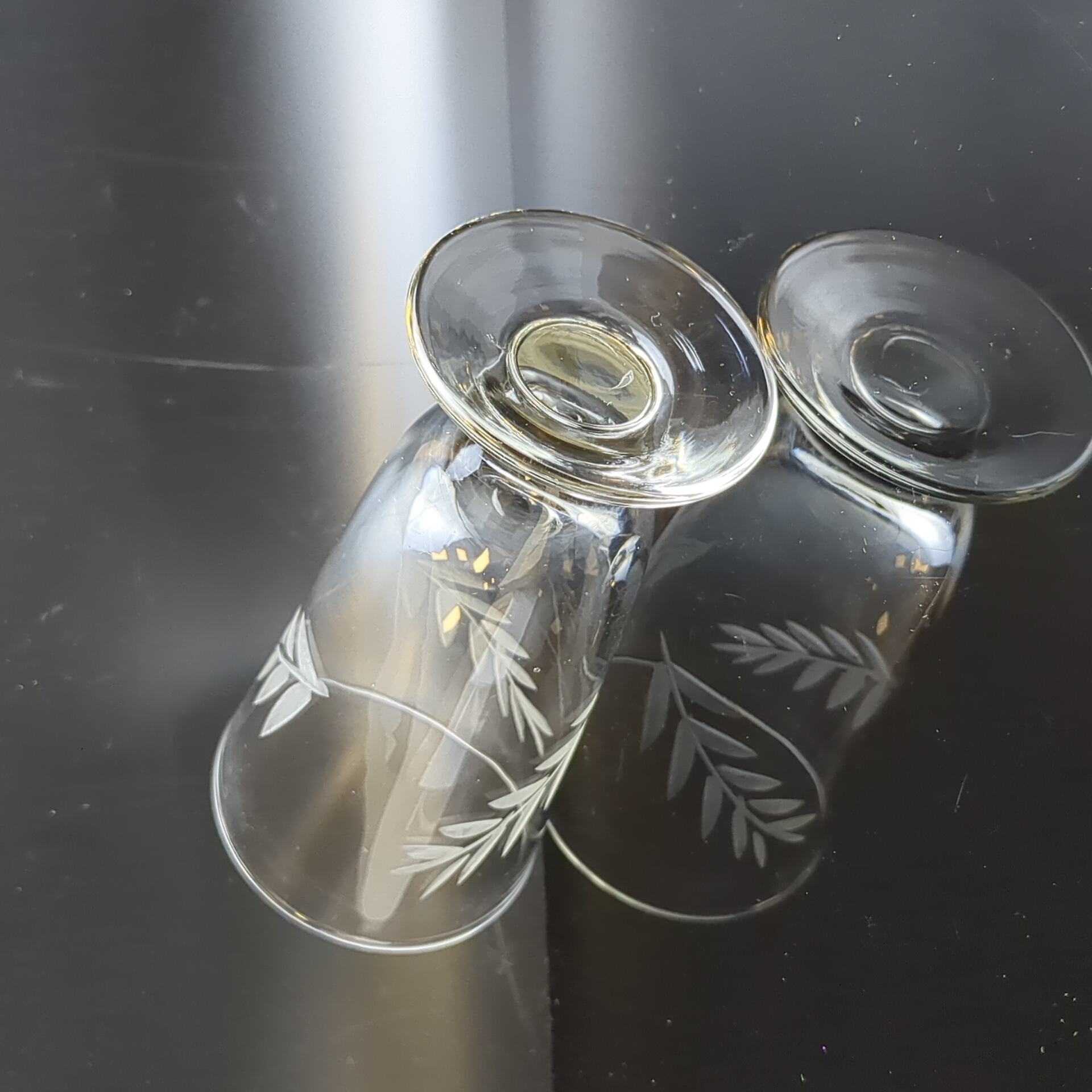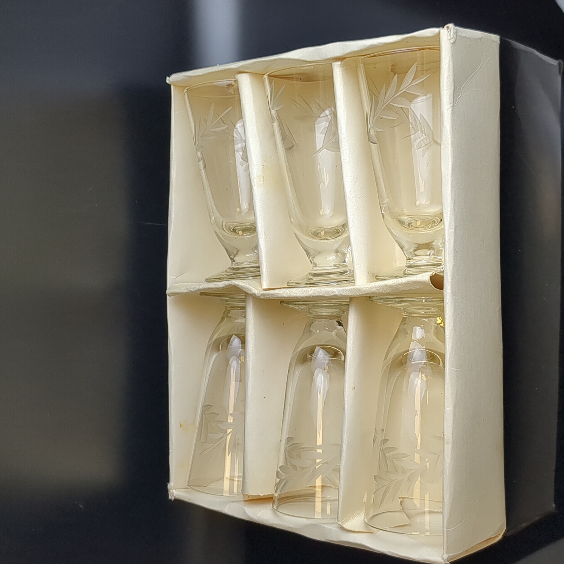 Рюмки на ножках набор из 6 штук в коробке, стекло, резной декор, высота - 11.3 см, винтаж СССР 1970-1990 гг. Состояние на фото