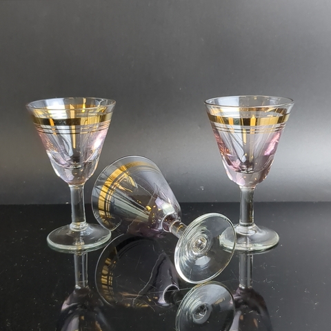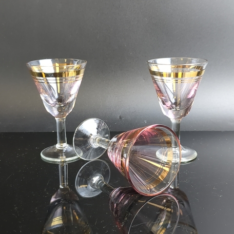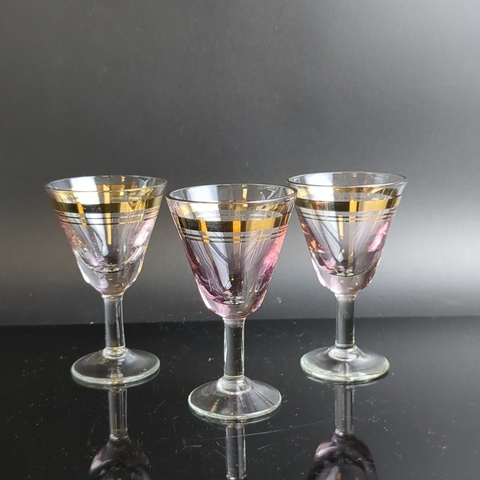 Рюмки на ножке набор из 3 штук стекло, розовое напыление, золотистый ободок, высота- 8.5 см, 25 мл., винтаж СССР 1960-1980 гг. Присутствуют следы использования- состояние на фото