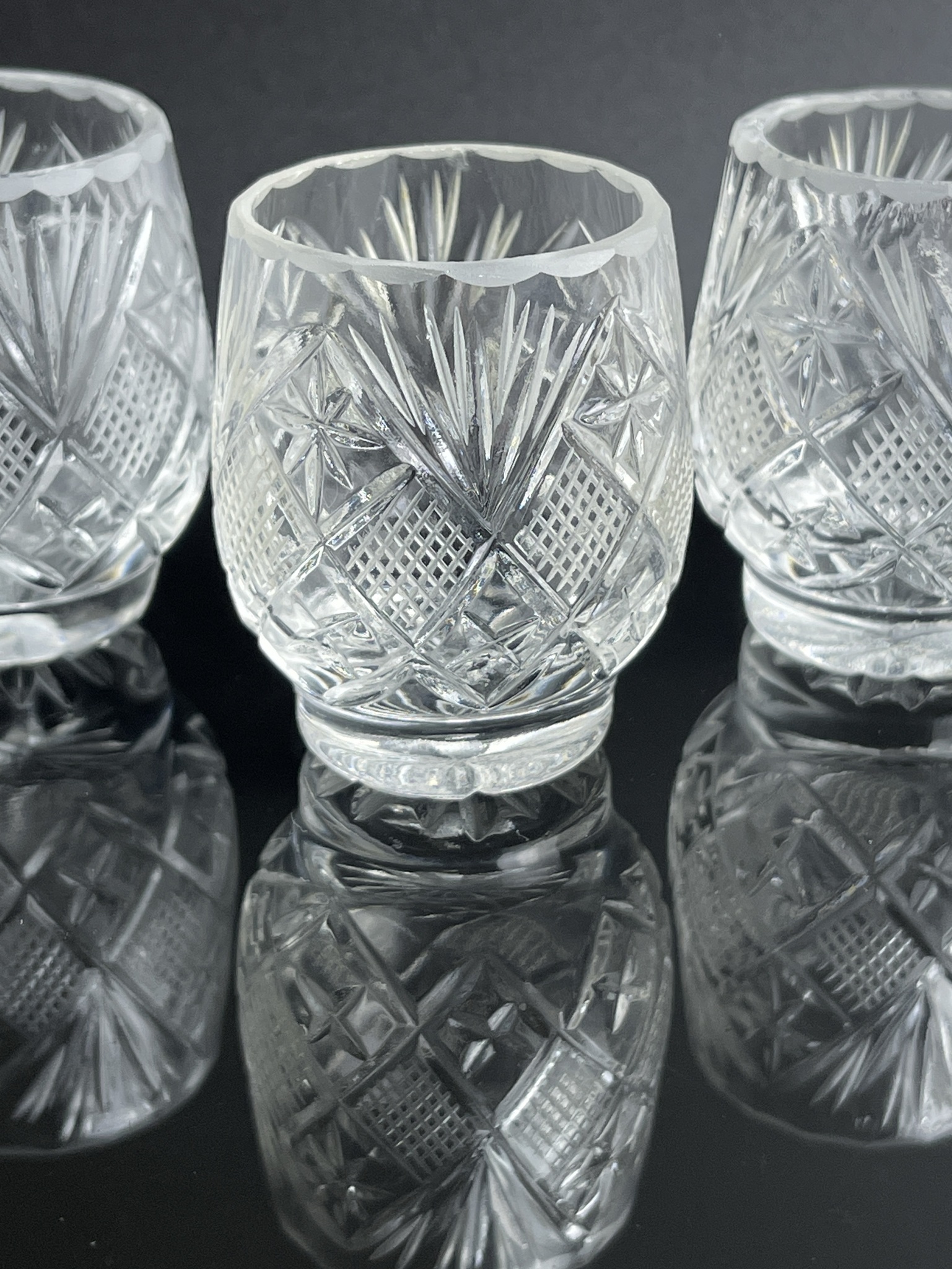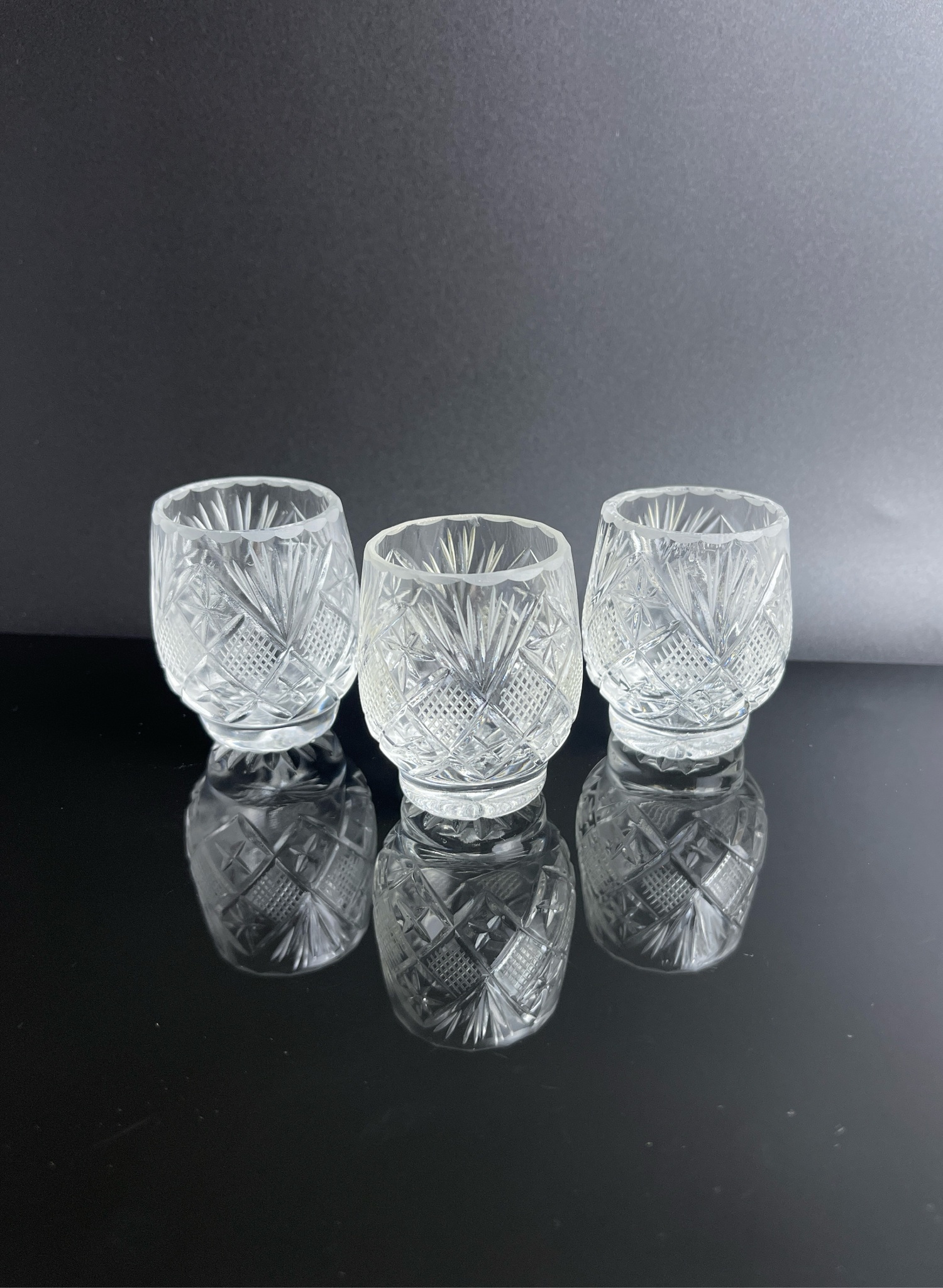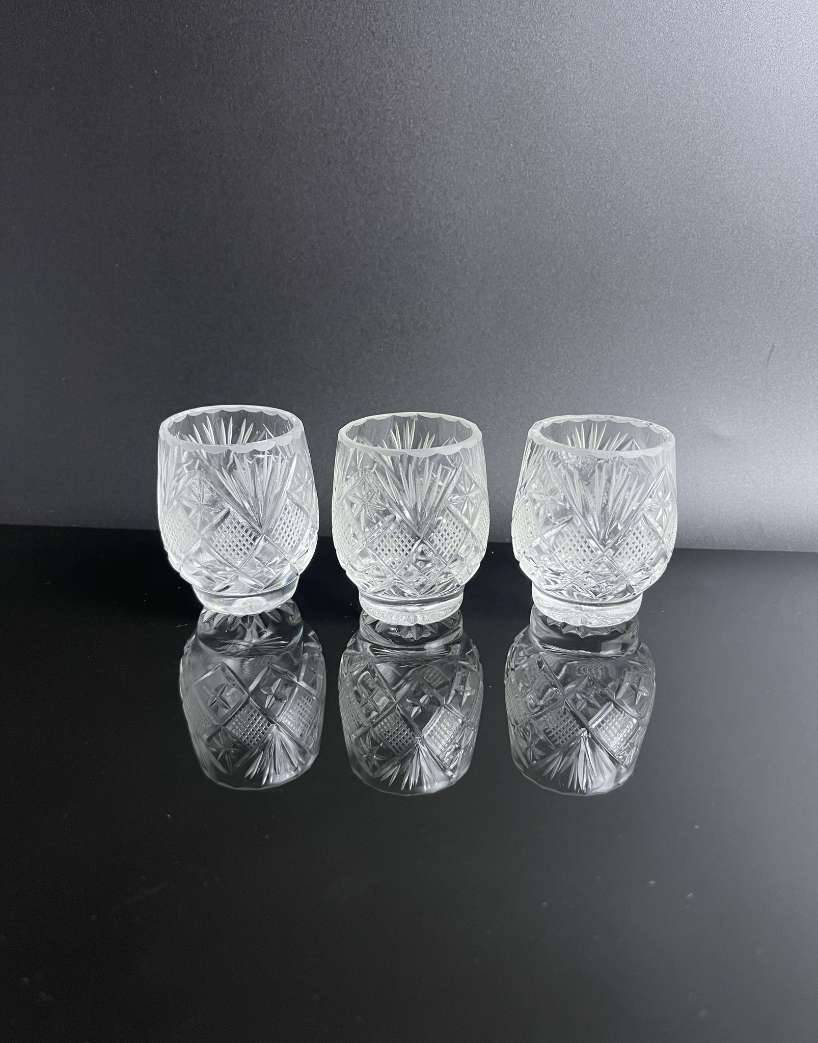 Рюмки набор из 3 штук хрусталь, 50 мл, алмазная грань, матовый декор, винтаж, СССР 1970-1990 гг. Высота - 5 см. Присутствуют следы использования, внутри одной рюмки одна сторона матовая- состояние на фото