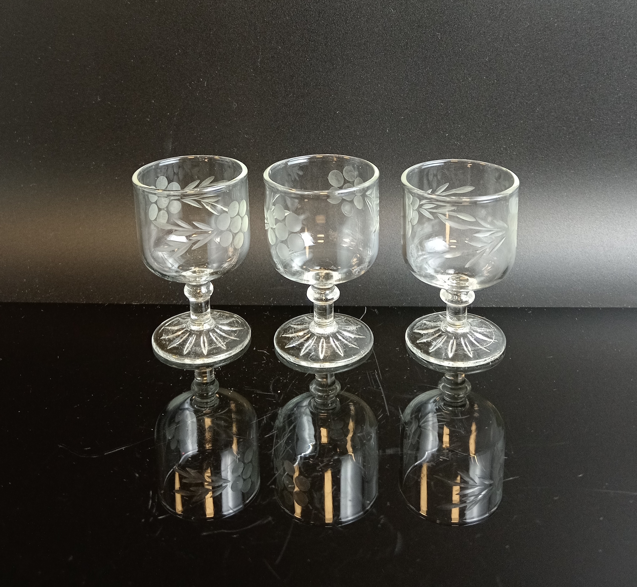 Рюмки набор из 3 штук стекло, резной декор ягоды, 25 мл., высота - 6 см, винтаж СССР 1970-1990 гг. Присутствуют следы использования - состояние на фото