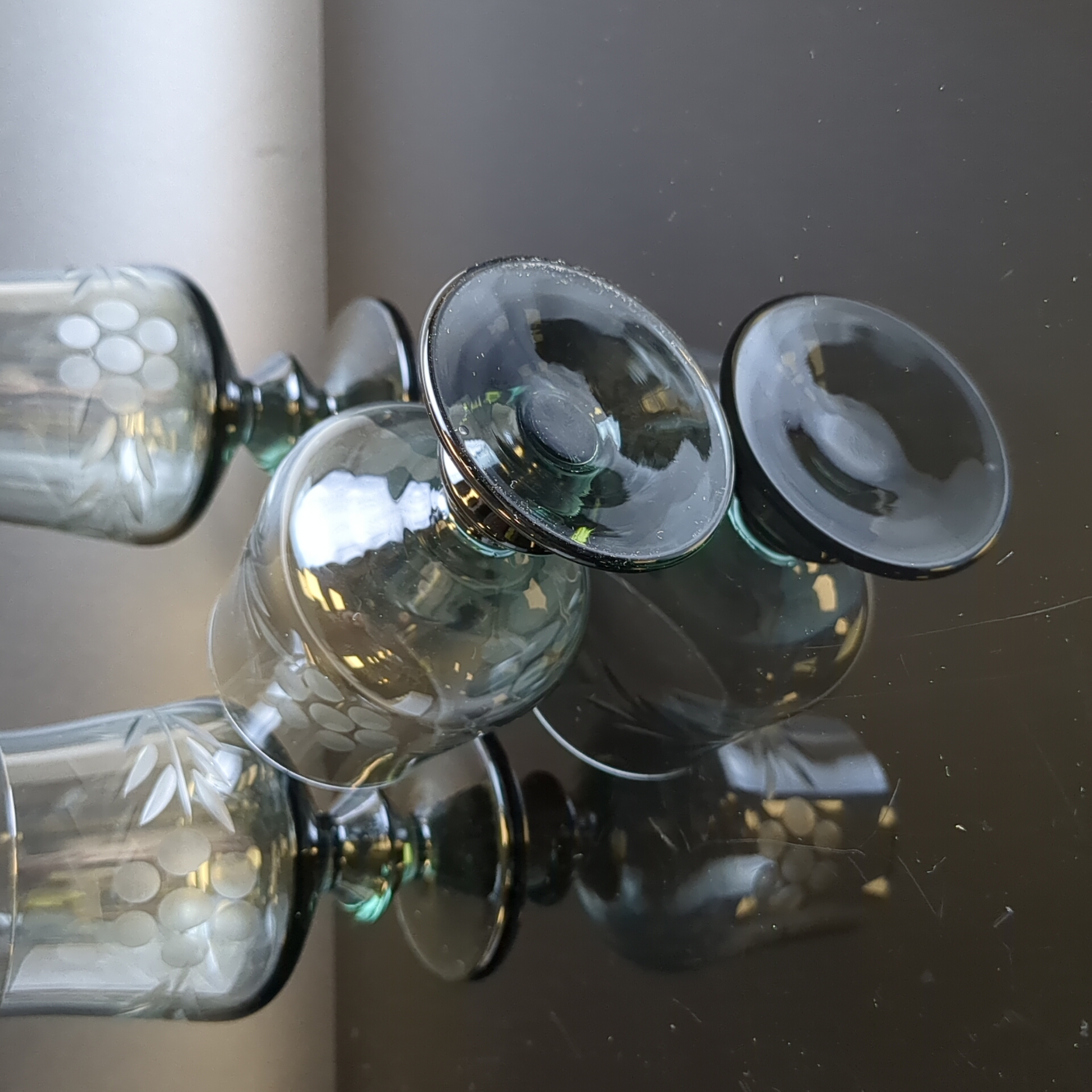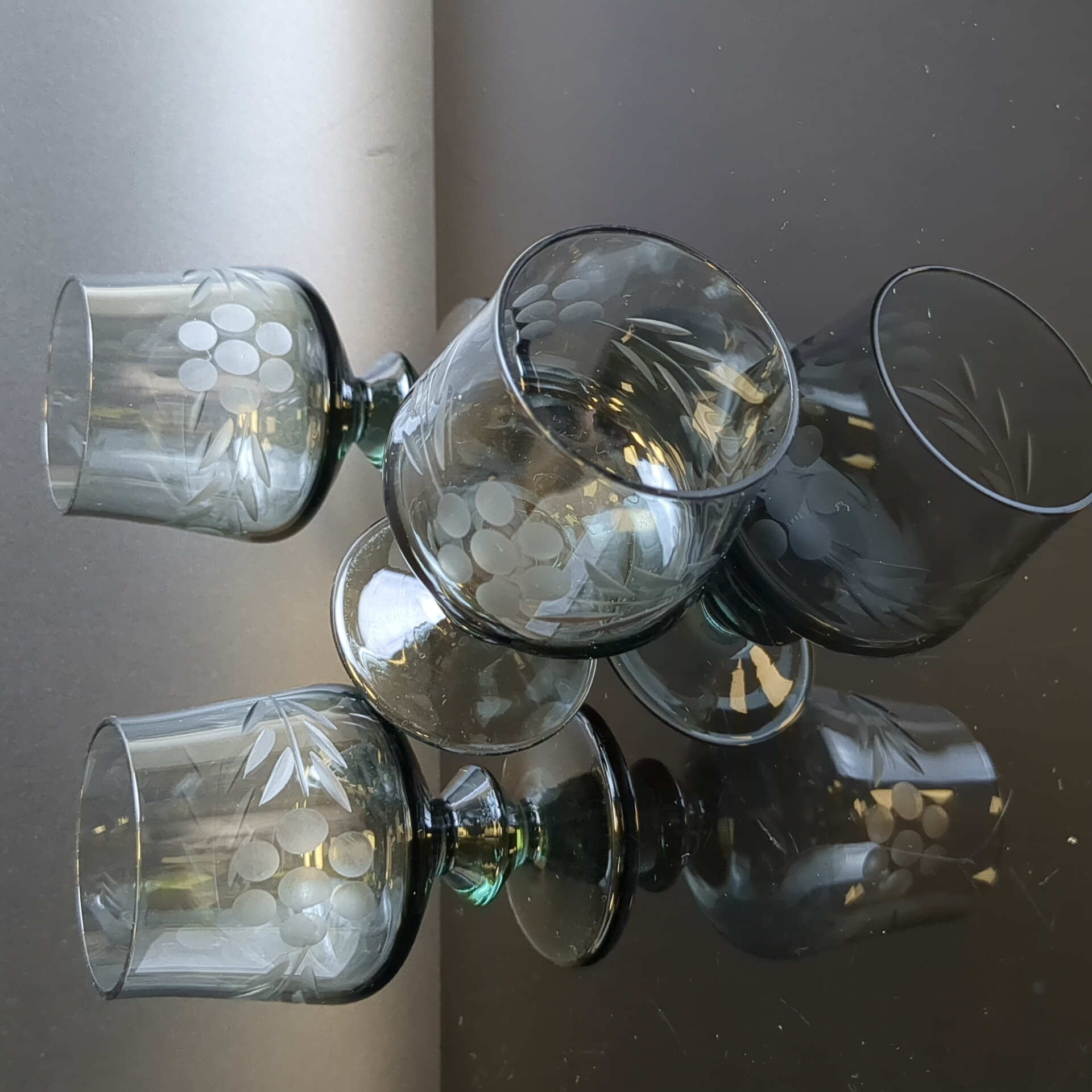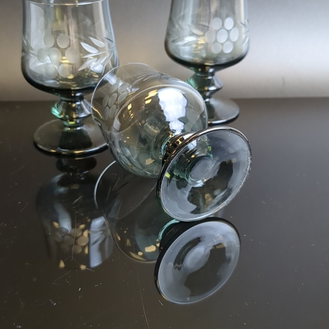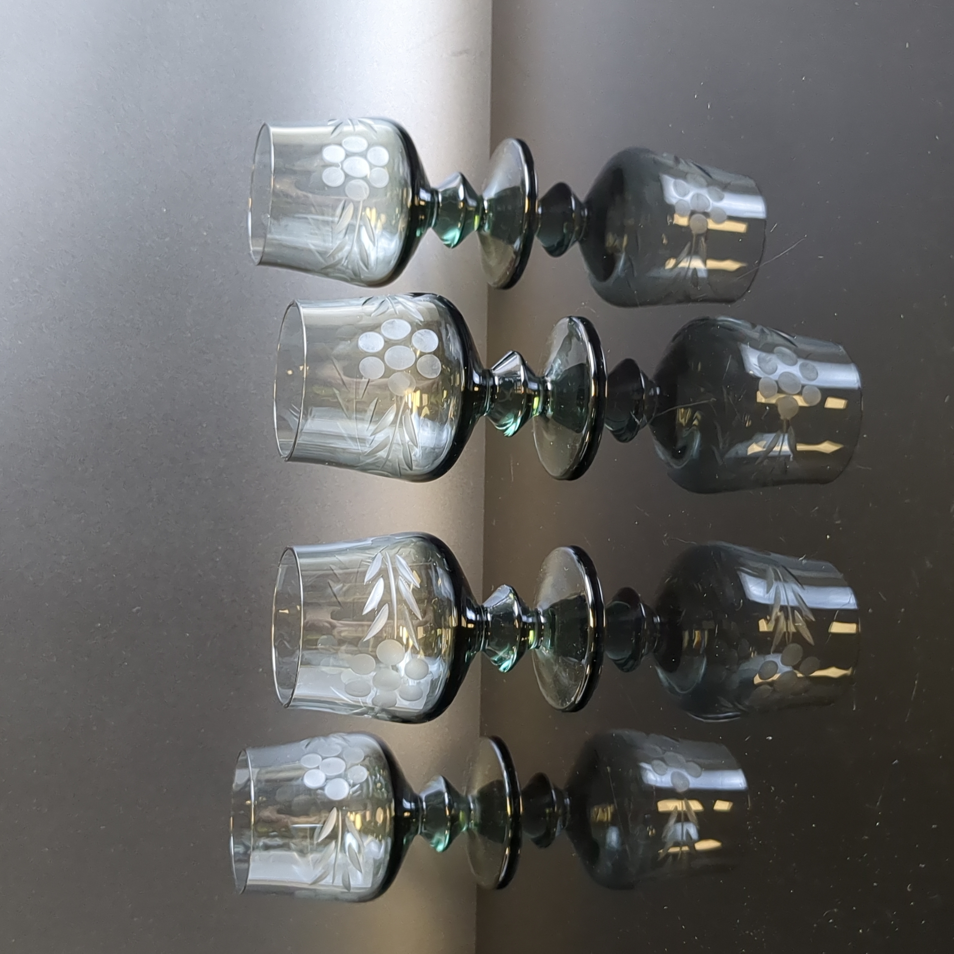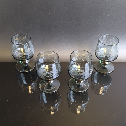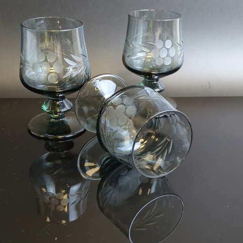 Рюмки набор из 4 штук на ножках "Рябина" дымчатое стекло, резной декор, винтаж СССР 1970-1990 гг. Высота - 8 см. Состояние и комплектация на фото