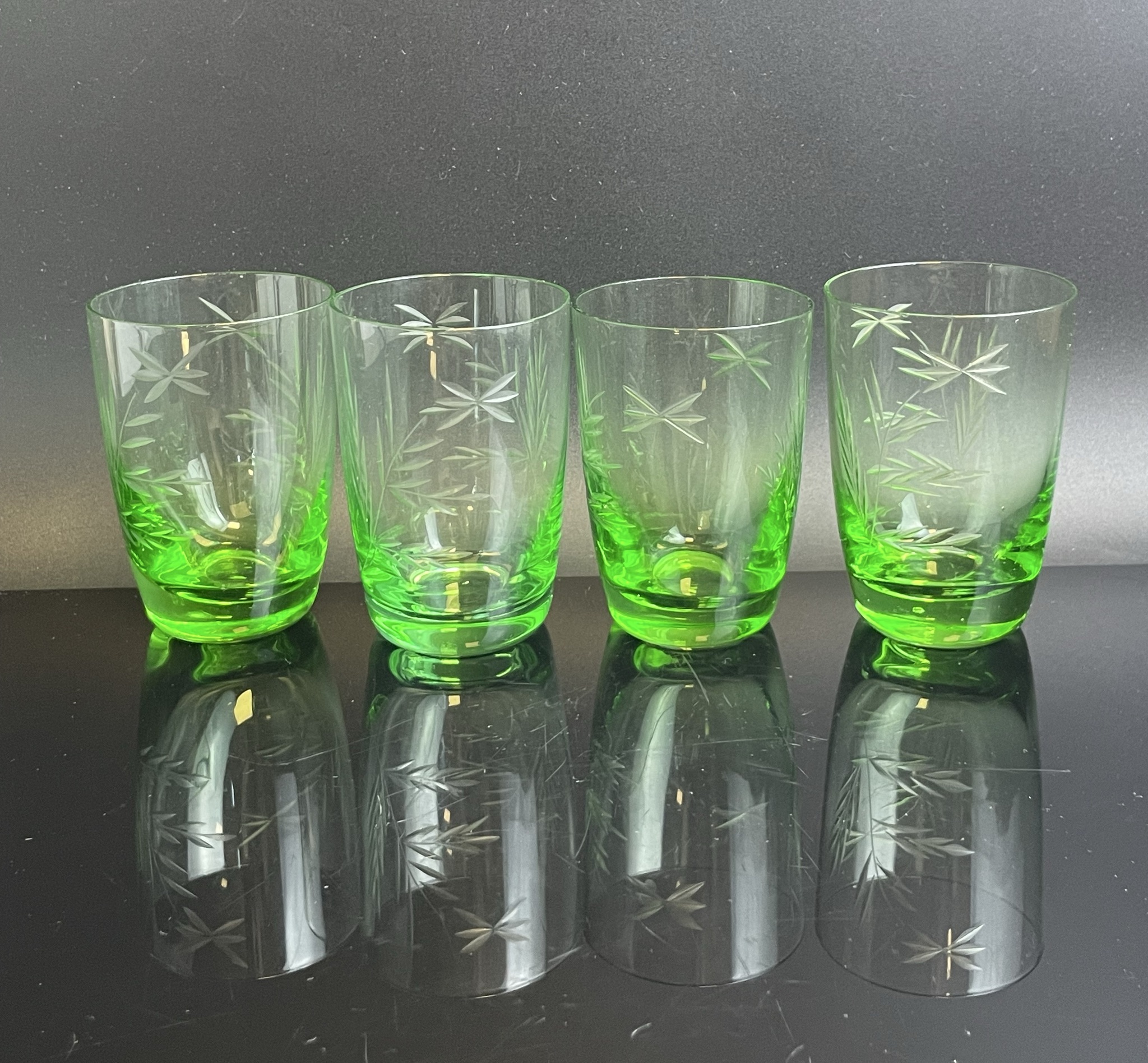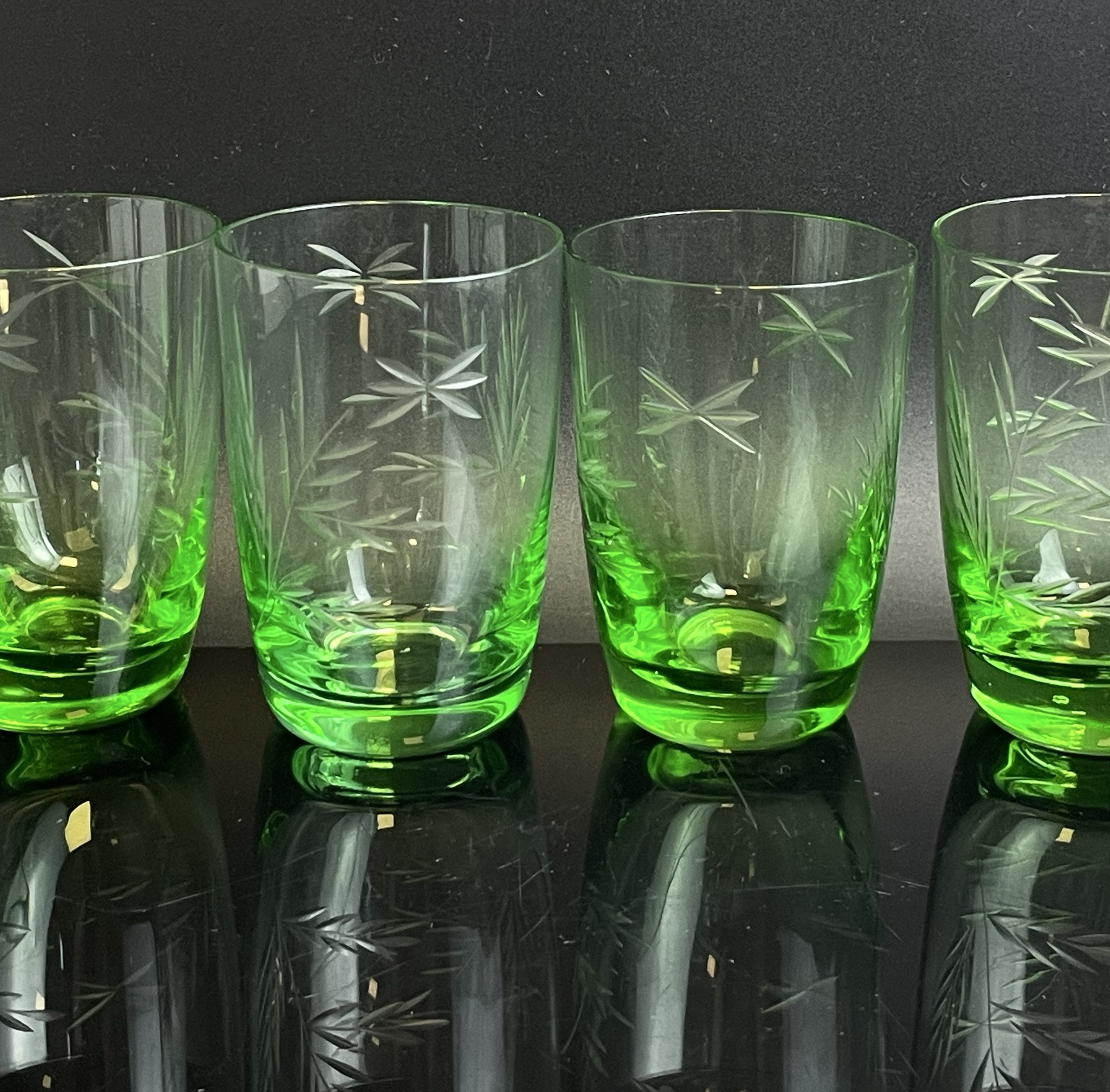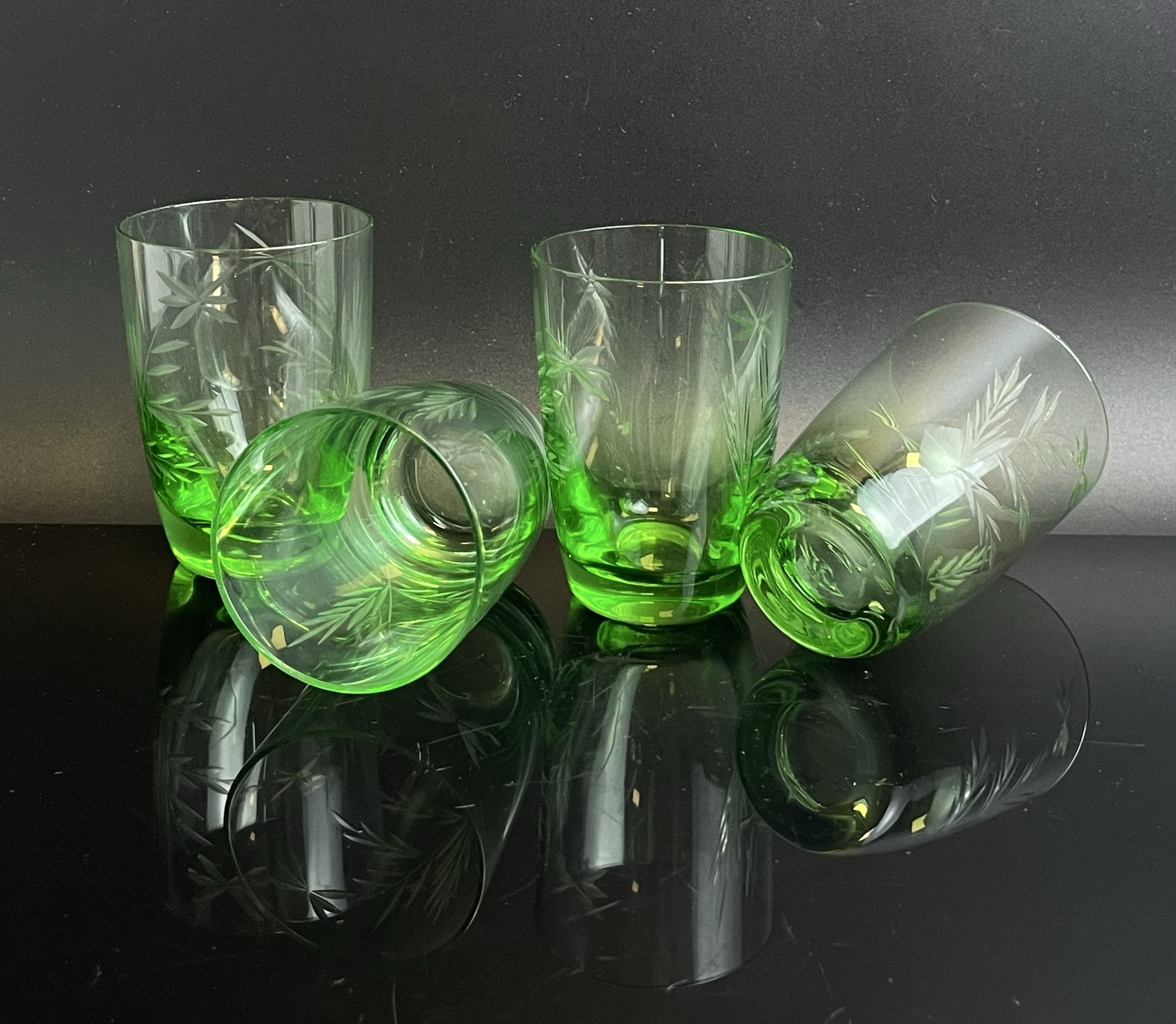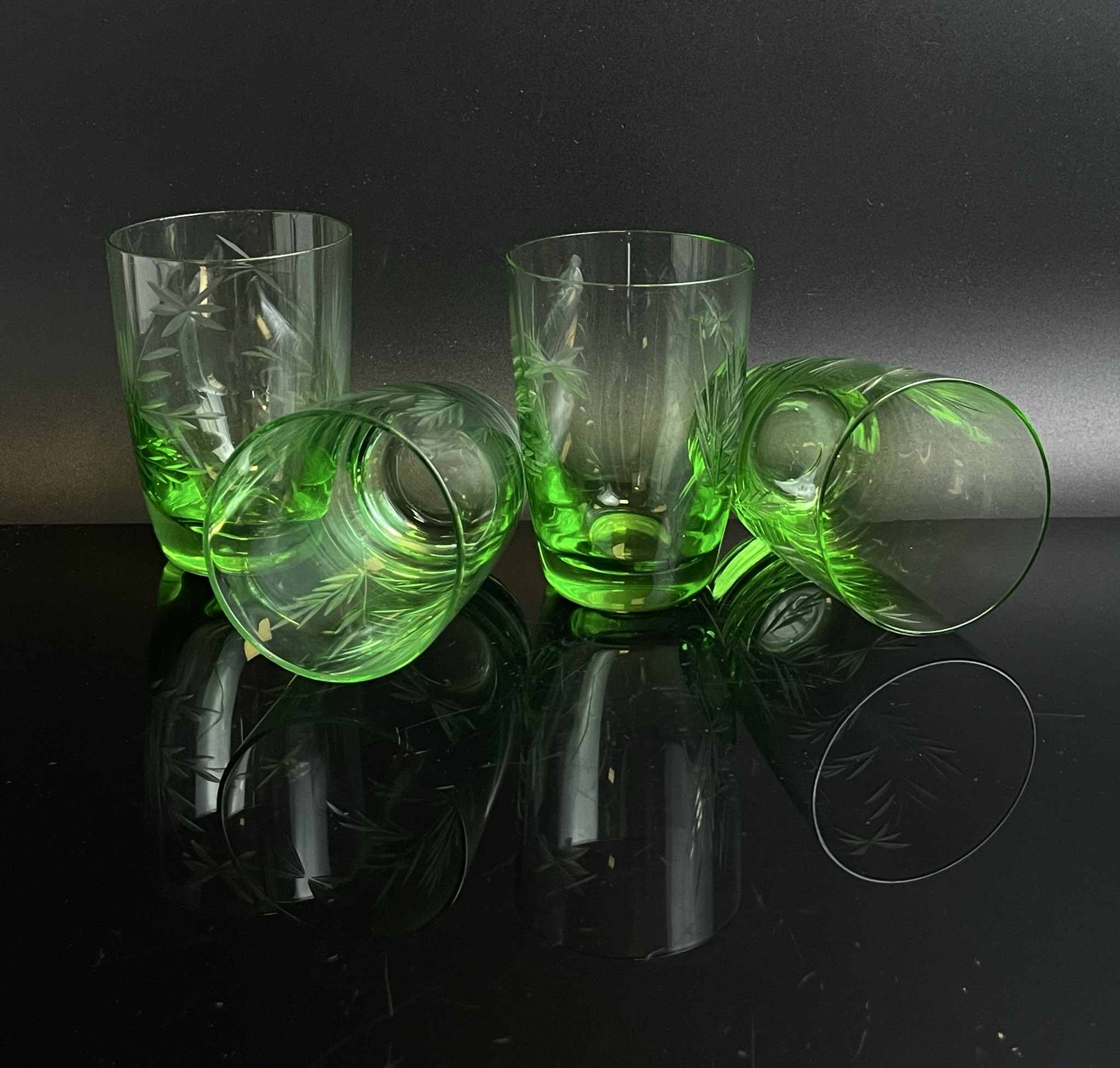 Рюмки набор из 4 штук, стекло зеленое цветное с резным декором, высота - 7.5 см, 75 мл., винтаж СССР 1970-1990 гг. Присутствуют следы использования- состояние на фото