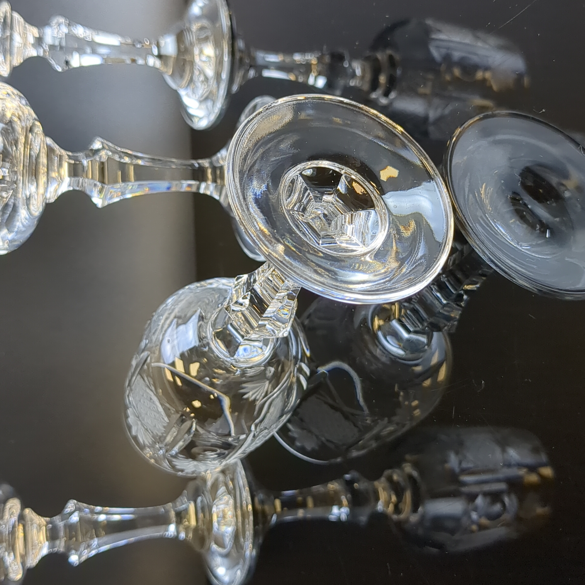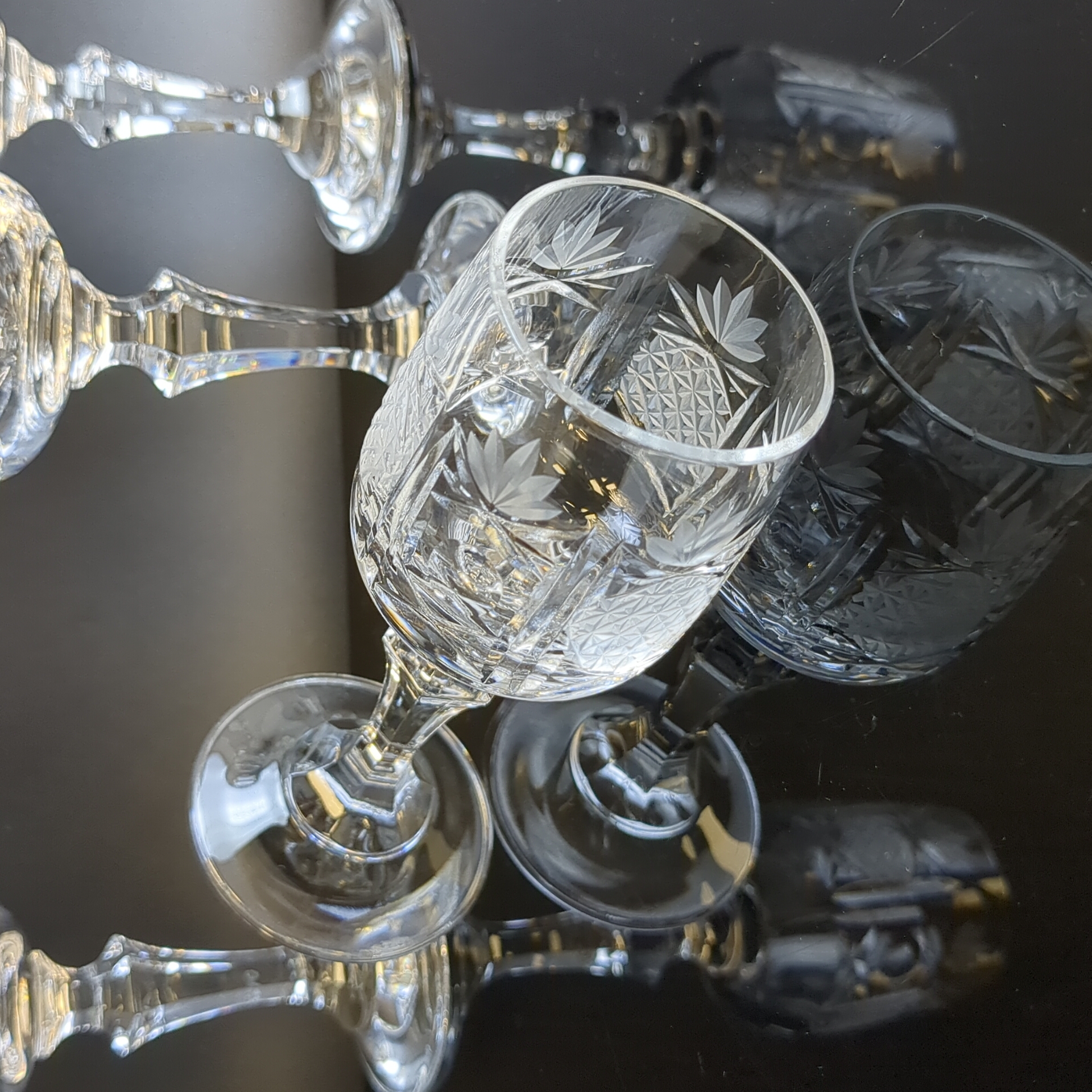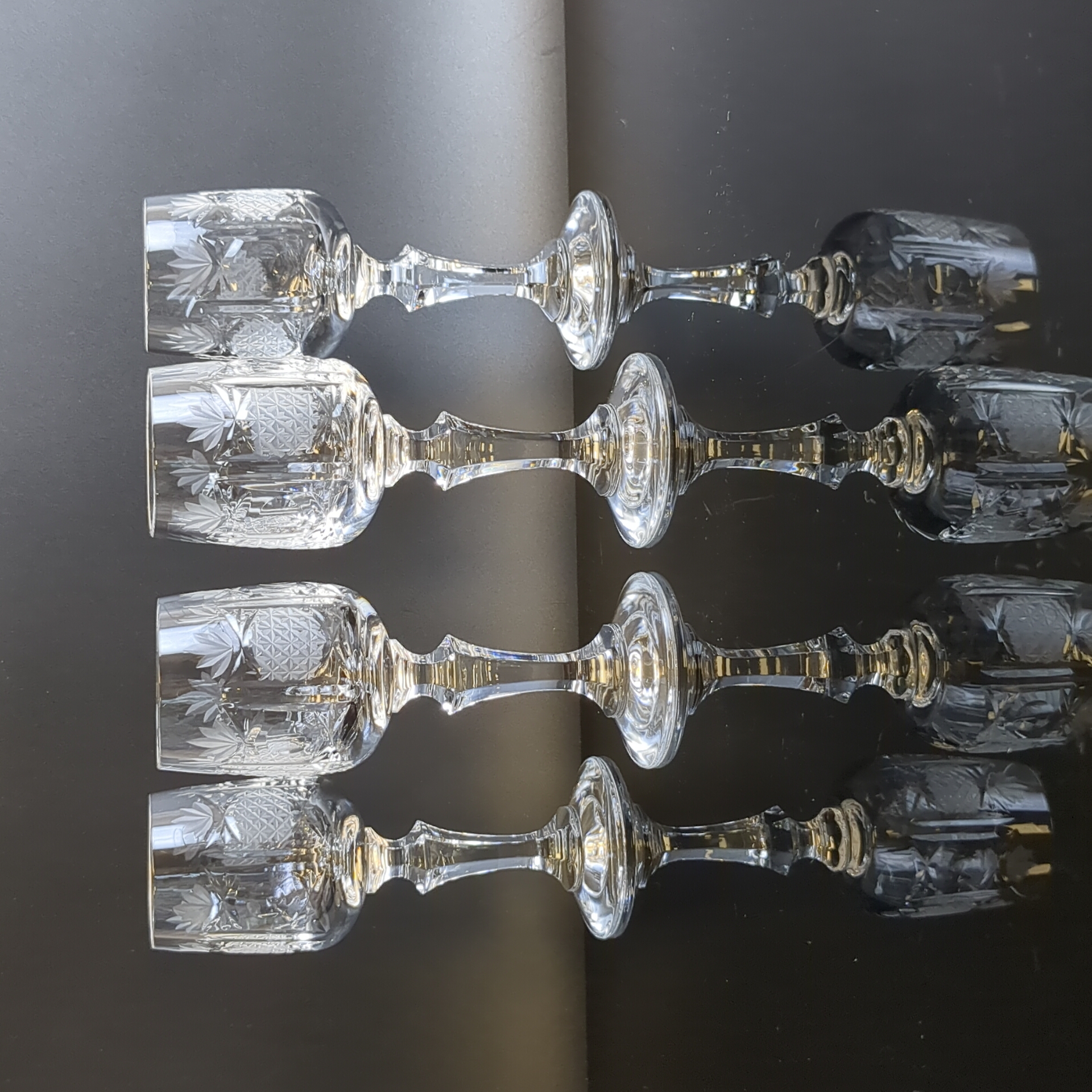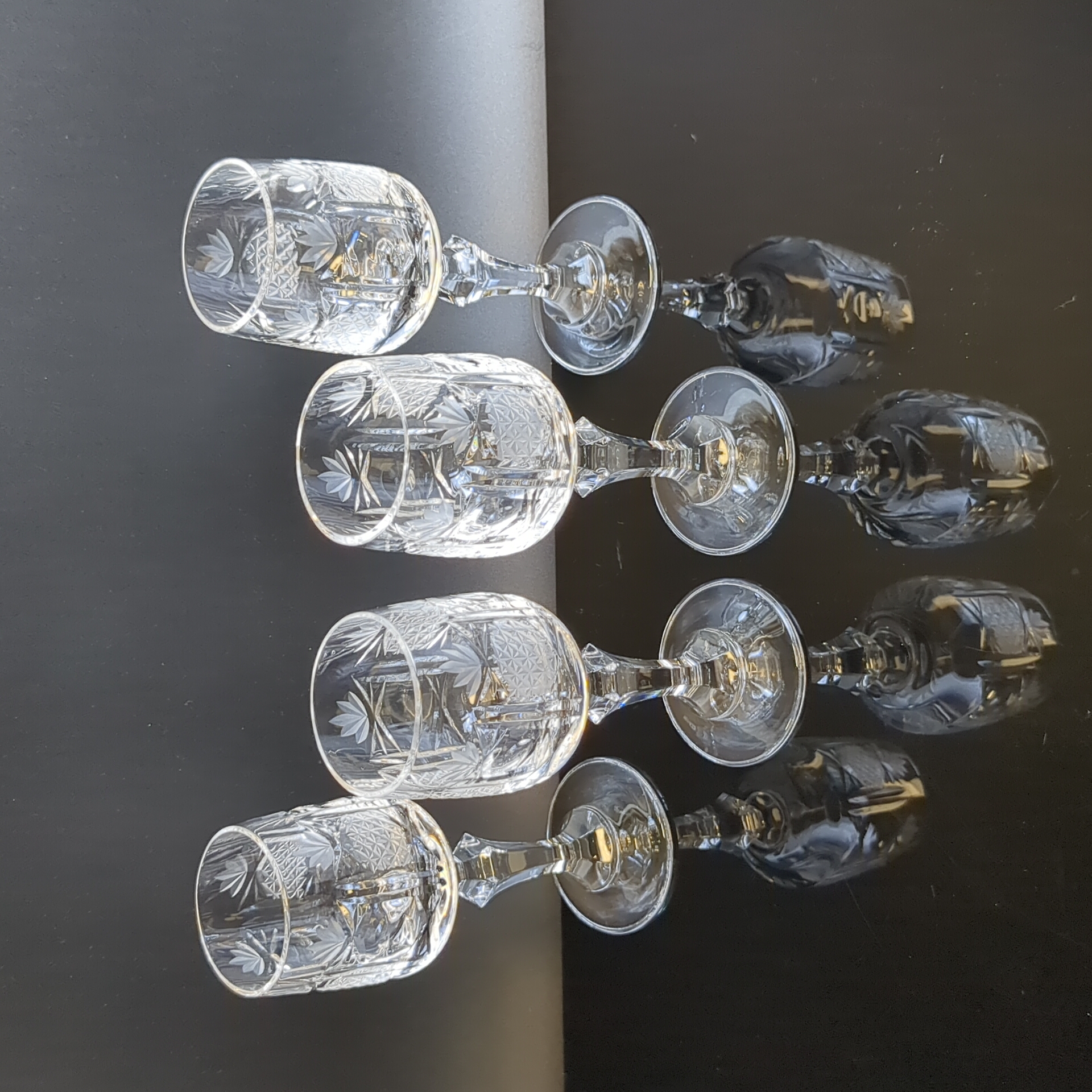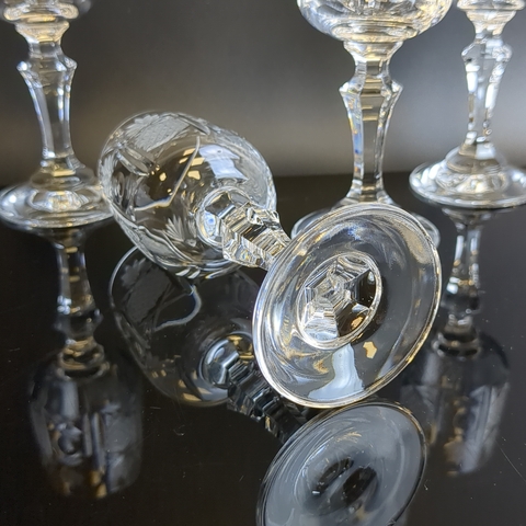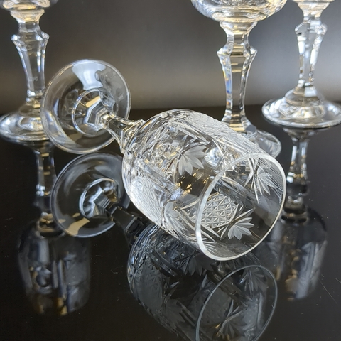 Рюмки набор из 4х штук хрустальные на изящной высокой ножке, алмазная грань, геометрический орнамент, матовый хрусталь, высота -12.5 см, винтаж СССР 1970-1990 гг.