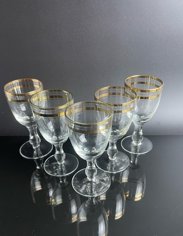Рюмки советское стекло набор из 5 штук на изящной ножке, винтаж, позолота, 75 мл, СССР 1960-1990 гг. Присутствуют следы использования, местами стерта позолота - состояние на фото. Высота- 11 см, диаметр верха - 5.3 см.