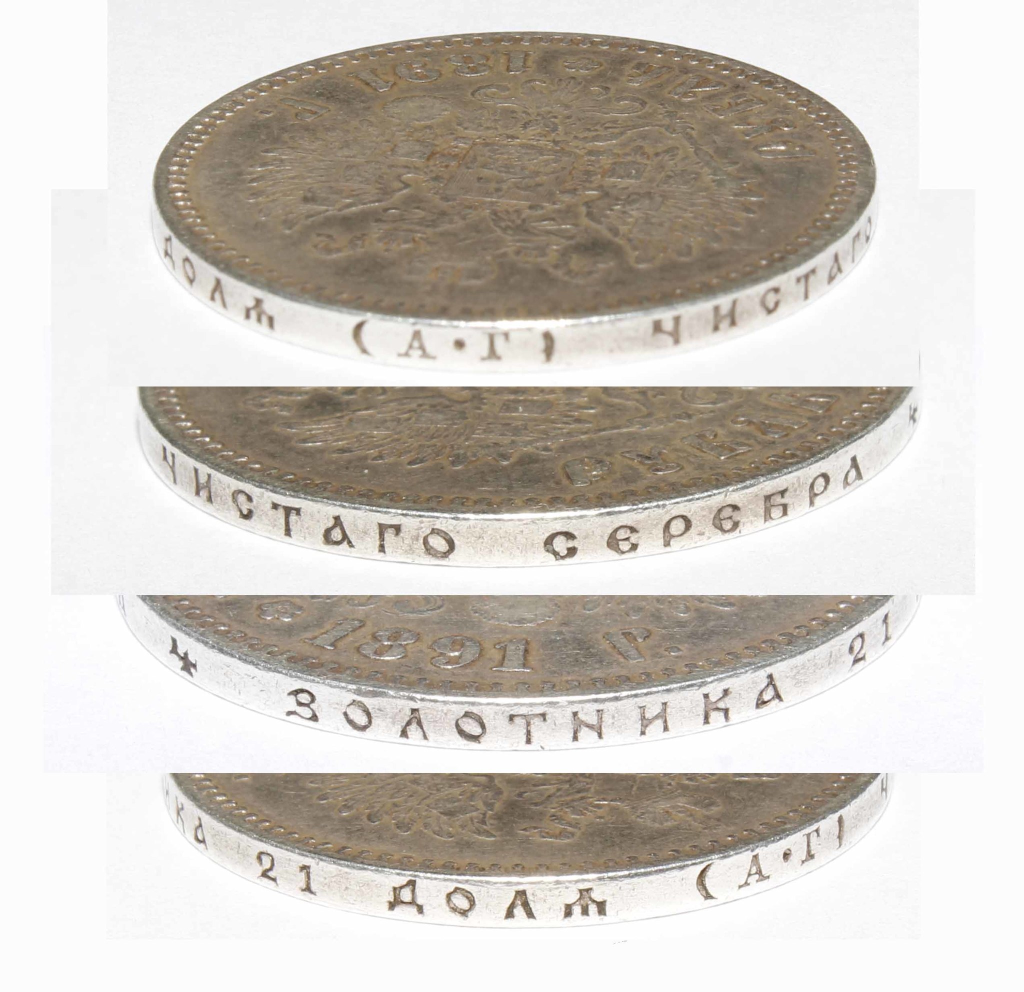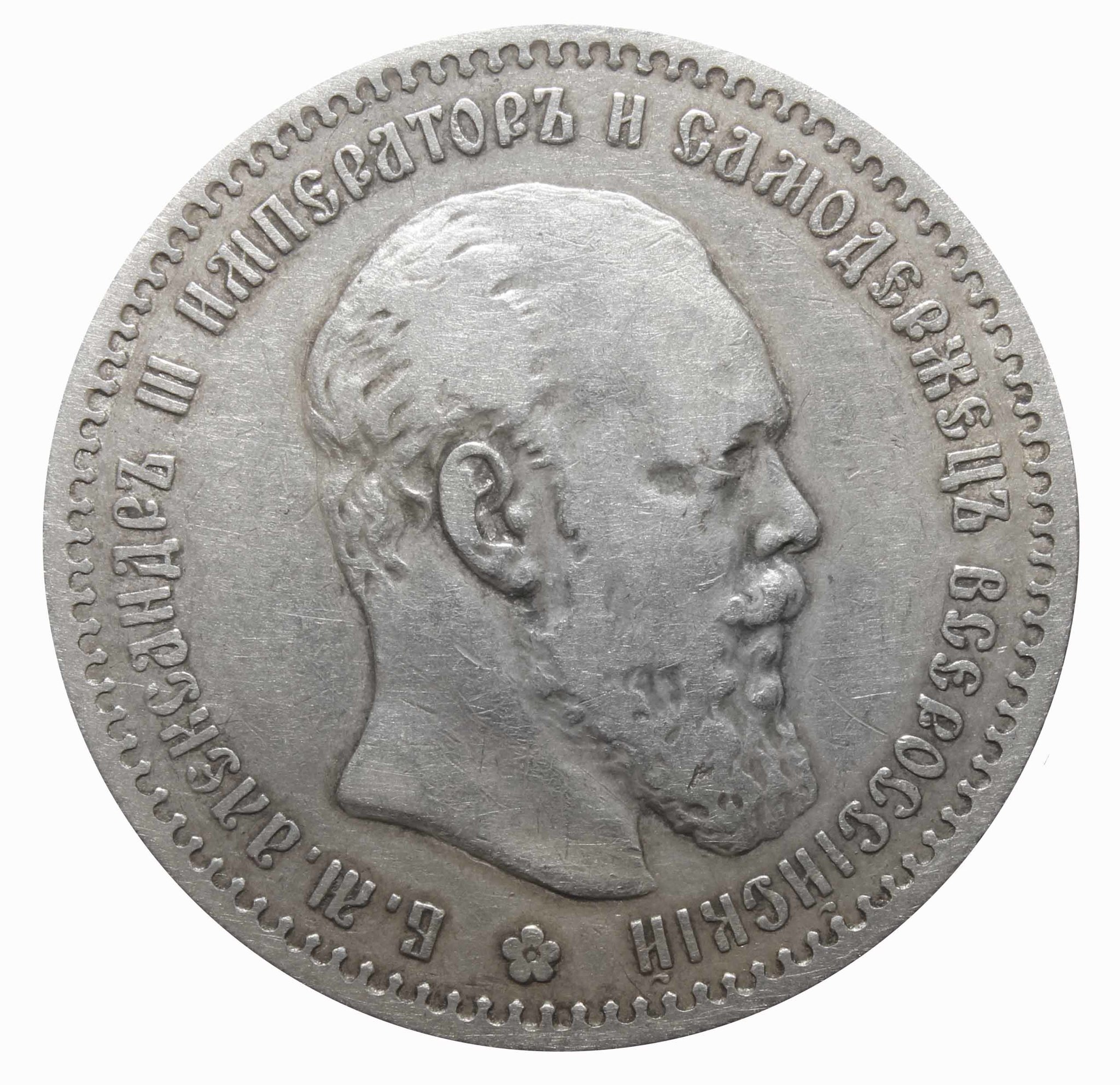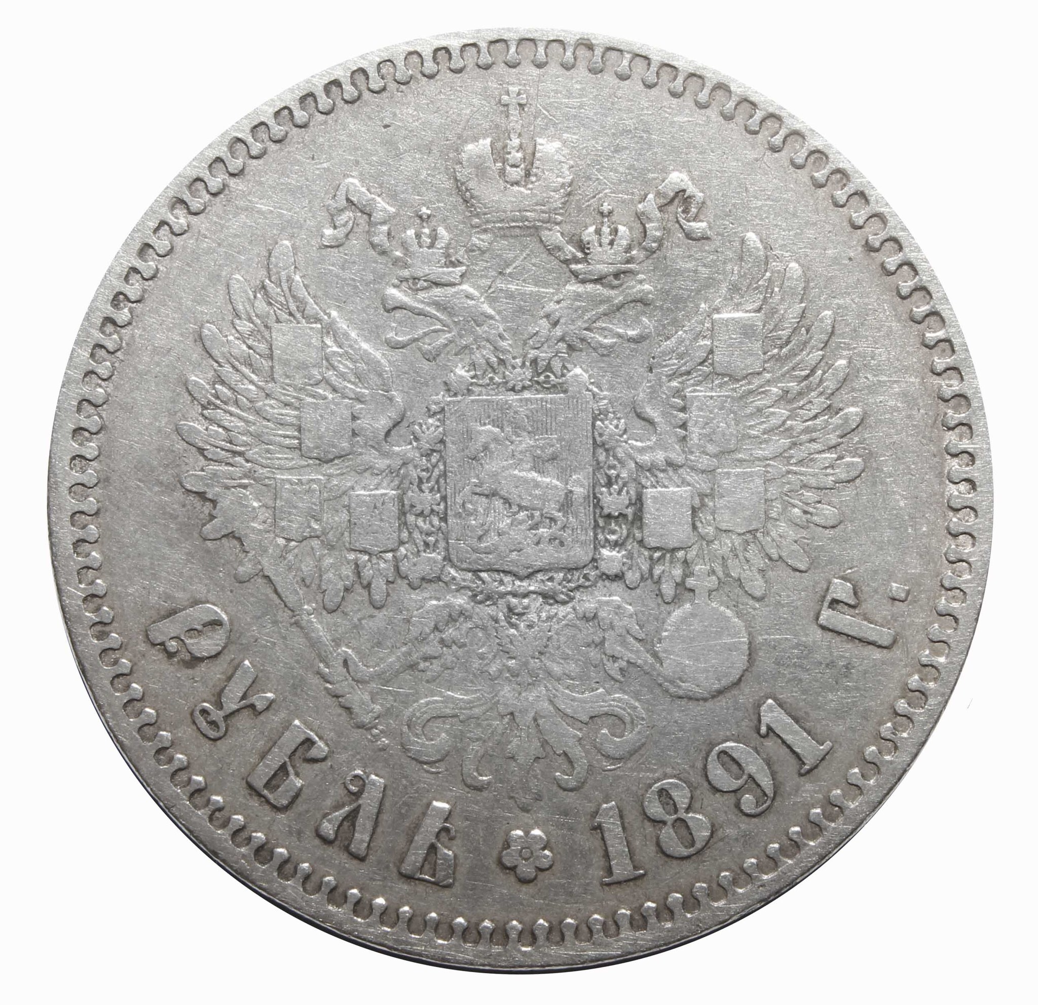 Реверс: В центре изображен Малый Государственный Герб Российской империи - двуглавый орёл, головы которого увенчаны двумя коронами, третья, большая корона над ними. Все они соединены орденской лентой ордена Св. Апостола Андрея Первозванного. На груди орла расположен Московский герб, в щите изображен Георгий Победоносец с копьем поражающий дракона. Вокруг щита цепь ордена Св. Апостола Андрея Первозванного. На крыльях изображены гербы: Царства Казанского, Польского, Херсонеса Таврического, Астраханского, Сибирского, Грузинского и герб соединенных княжеств Киевского, Новгородского и Владимирского — по 4 на каждое крыло. В правой лапе орла – скипетр, в левой – держава. Под ним слева направо изображены: номинал - надпись «РУБЛЬ», цветочная розетка и дата выпуска «1891 Г.». По окружности канта имеются рельефные элементы, выполненные в виде зубцов.