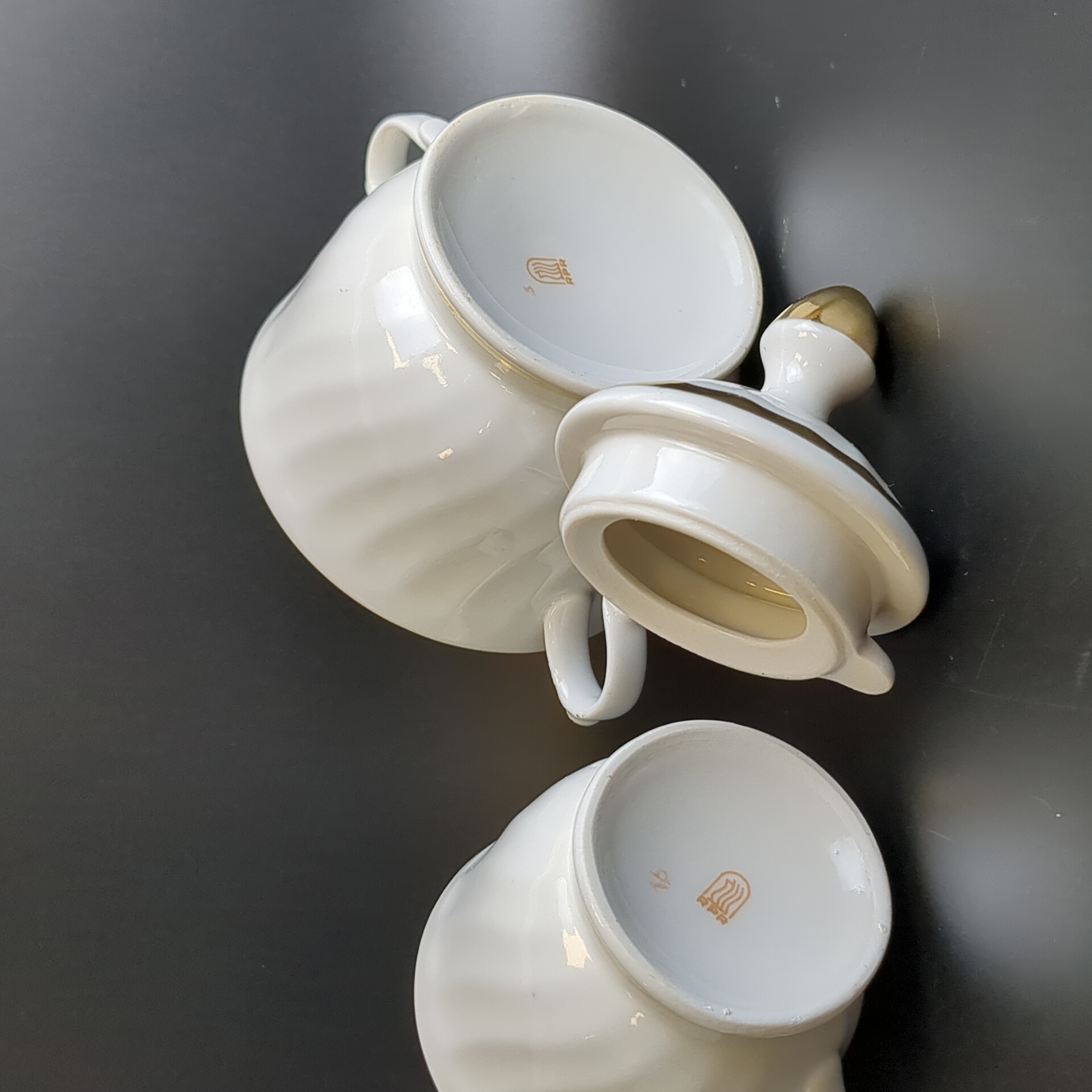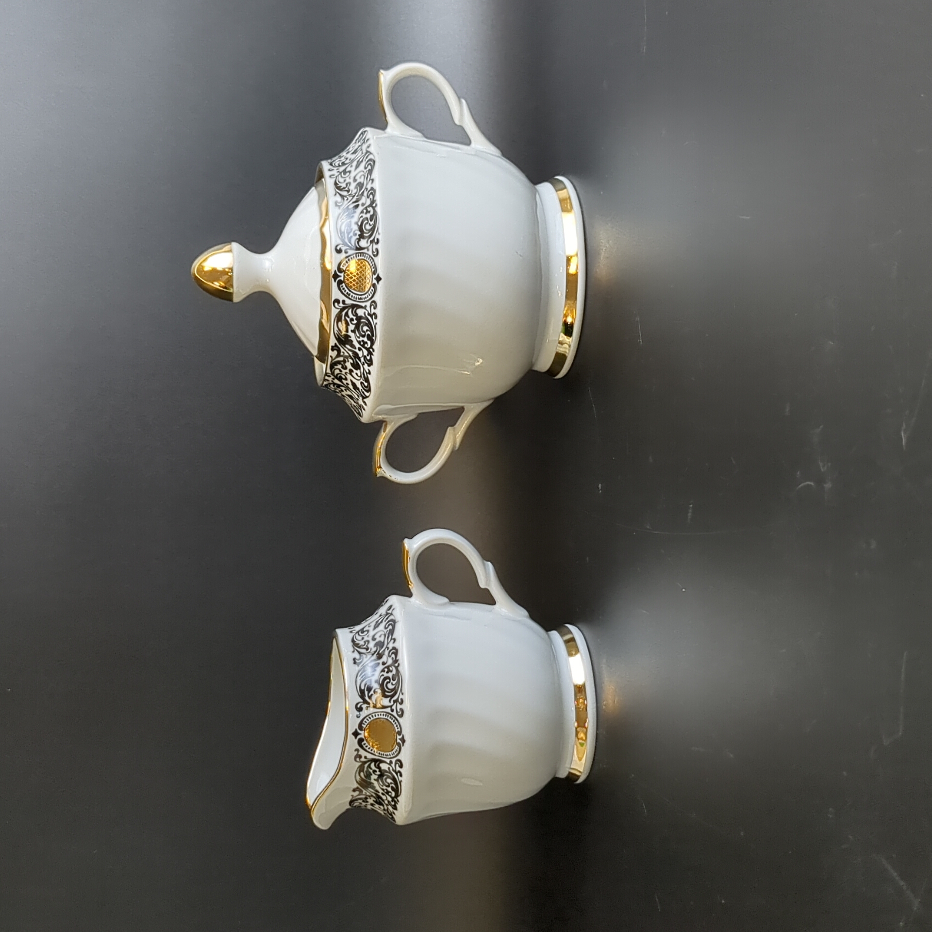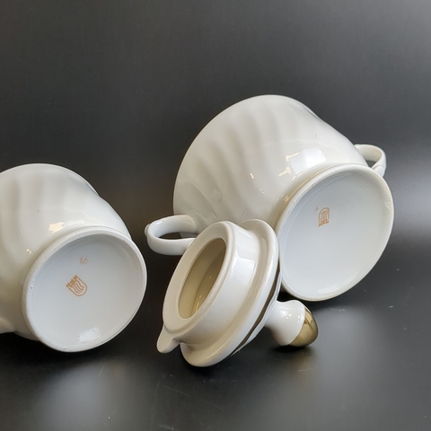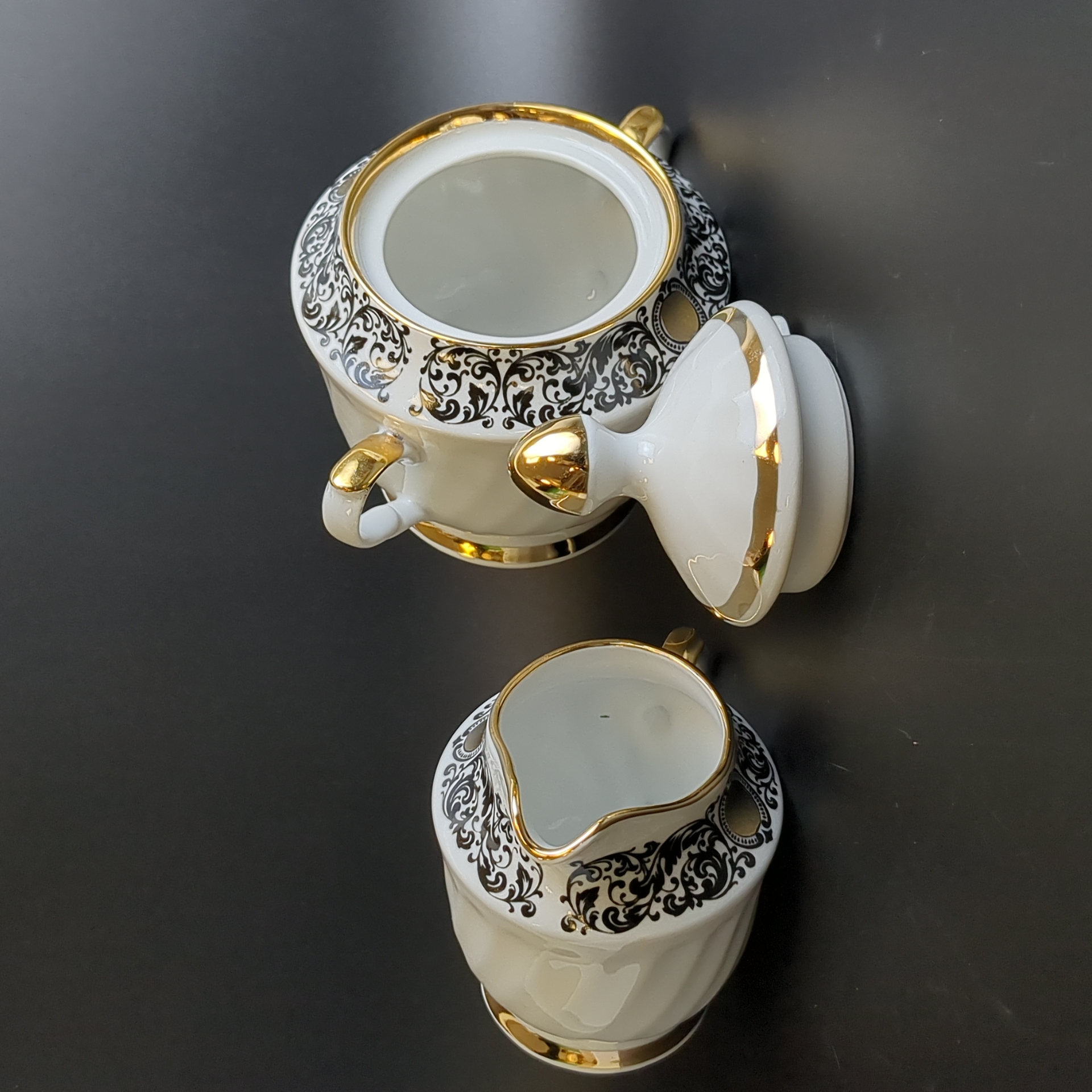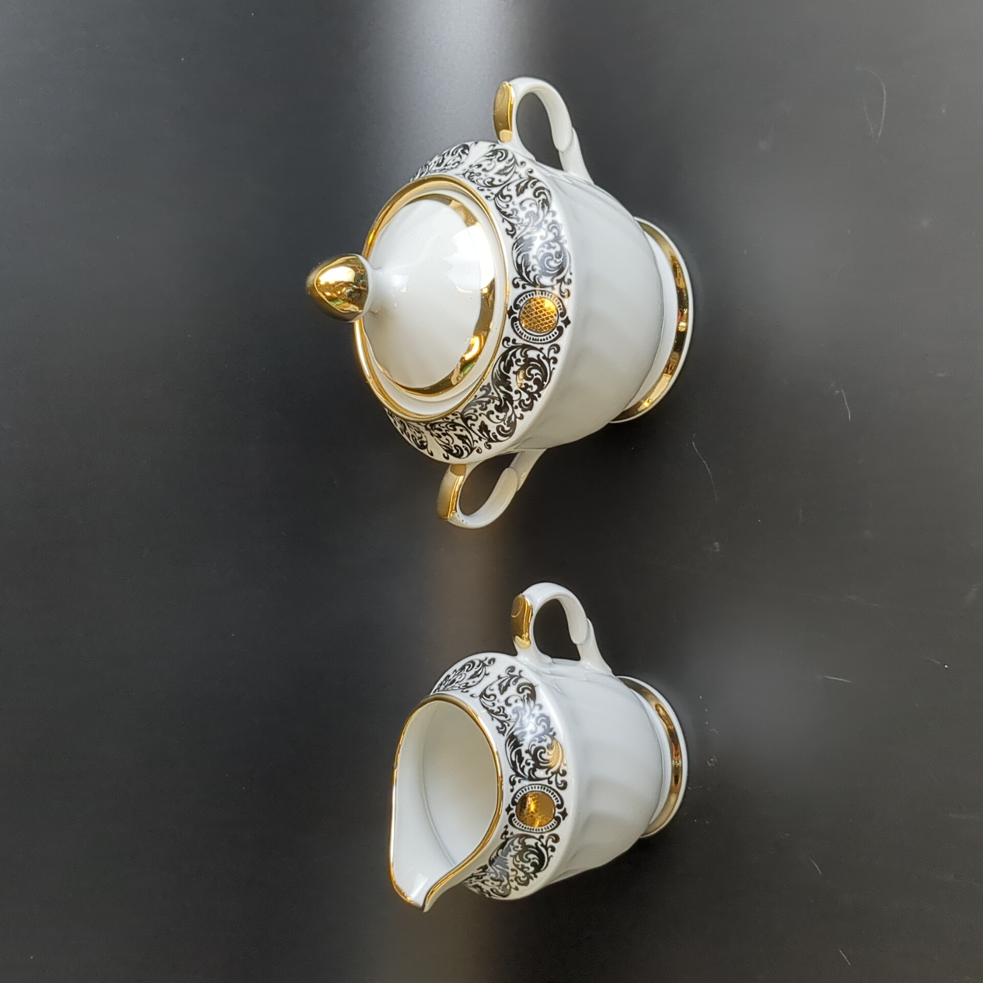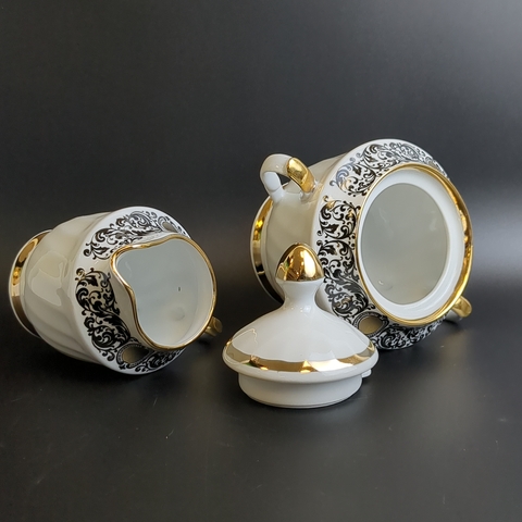 Сахарница и сливочник фарфоровые из сервиза, декор, золочение, винтаж времен СССР, Рига 1980-е гг. Высота сахарницы - 13 см, высота сливочника - 9 см. Состояние и комплектация на фото.