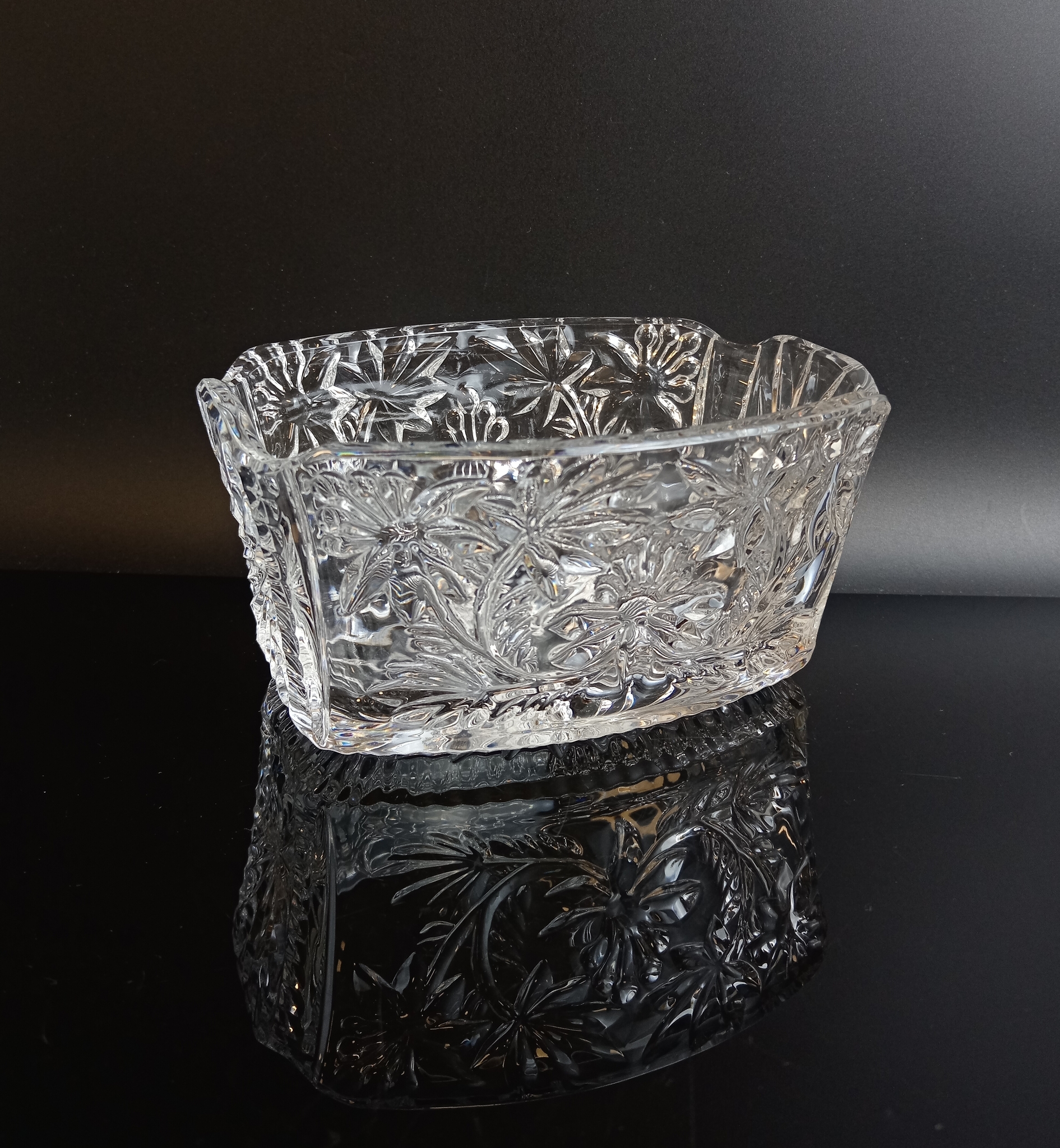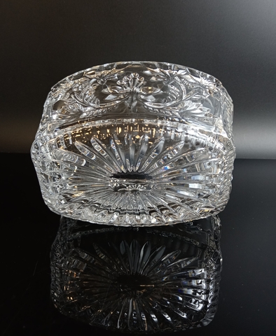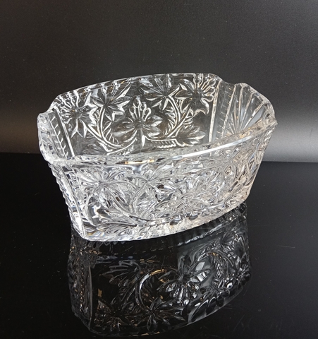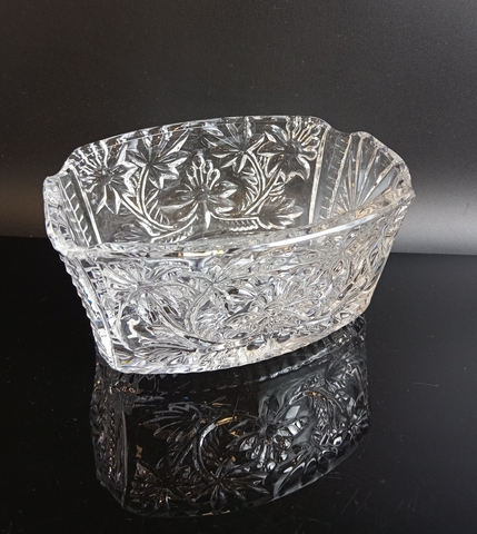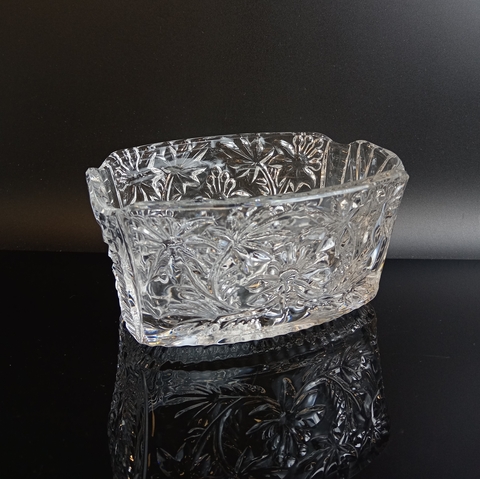 Салатник для слоёных салатов, хрустальный, алмазная грань, изящный цветочный орнамент, винтаж СССР 1970-1990 гг. Высота - 8 см, длина - 16 см. Присутствуют следы использования - состояние на фото.