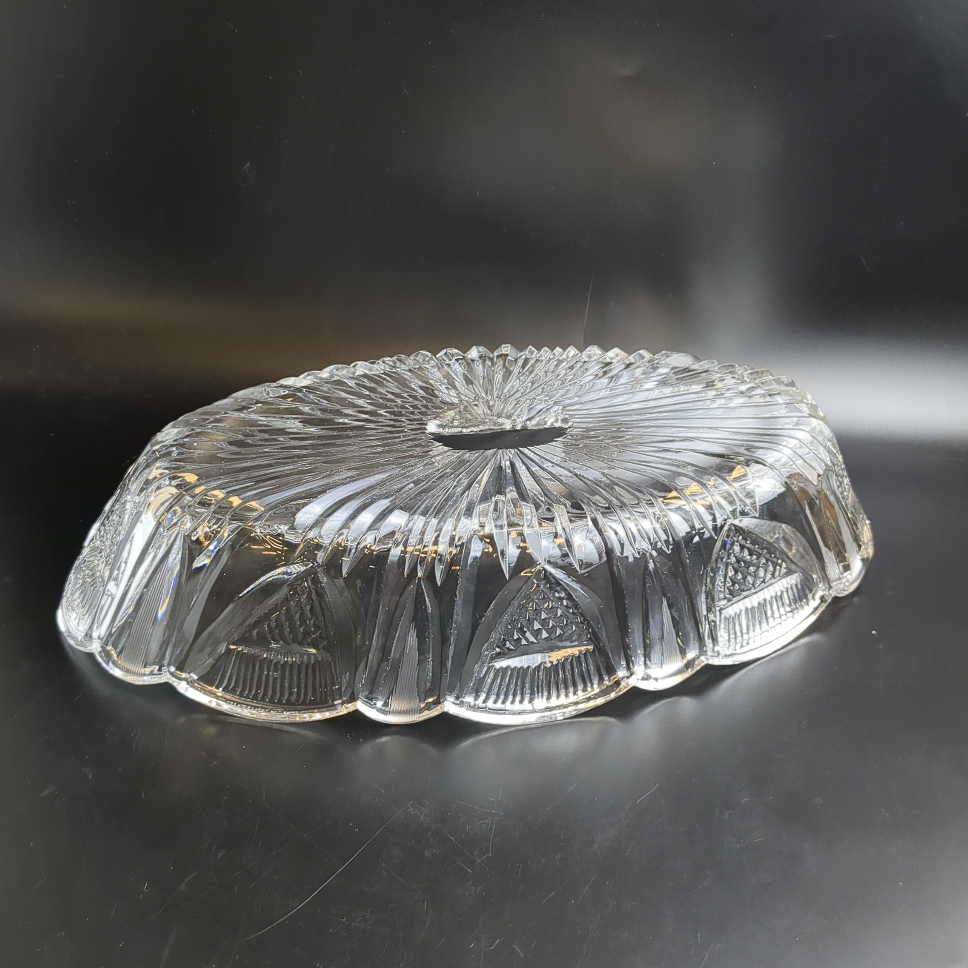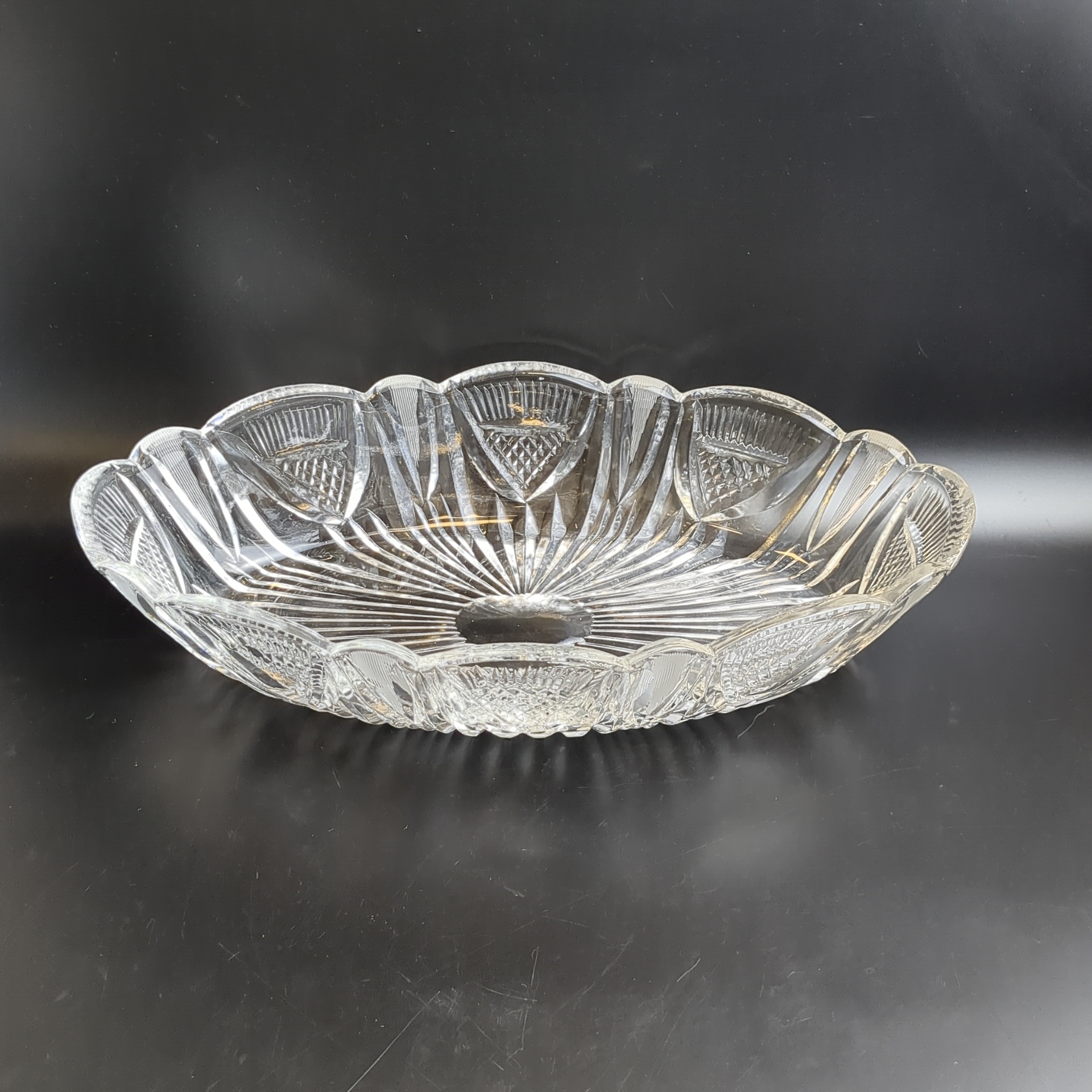Салатник хрустальный Ладья с геометрическим орнаментом, алмазная грань, винтаж СССР 1970-1990 гг. Высота - 7.5 см. Длина - 34.5 см. Состояние на фото