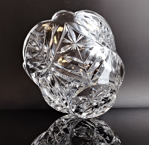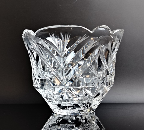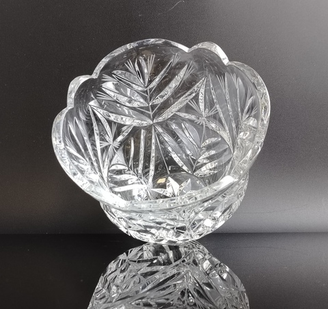 Салатник хрустальный в форме цветка, изящное исполнение, алмазная грань, геометрический узор, винтаж СССР 1970-1990 гг. Высота - 10.5 см, диаметр - 14 см. Присутствуют следы использования- состояние на фото