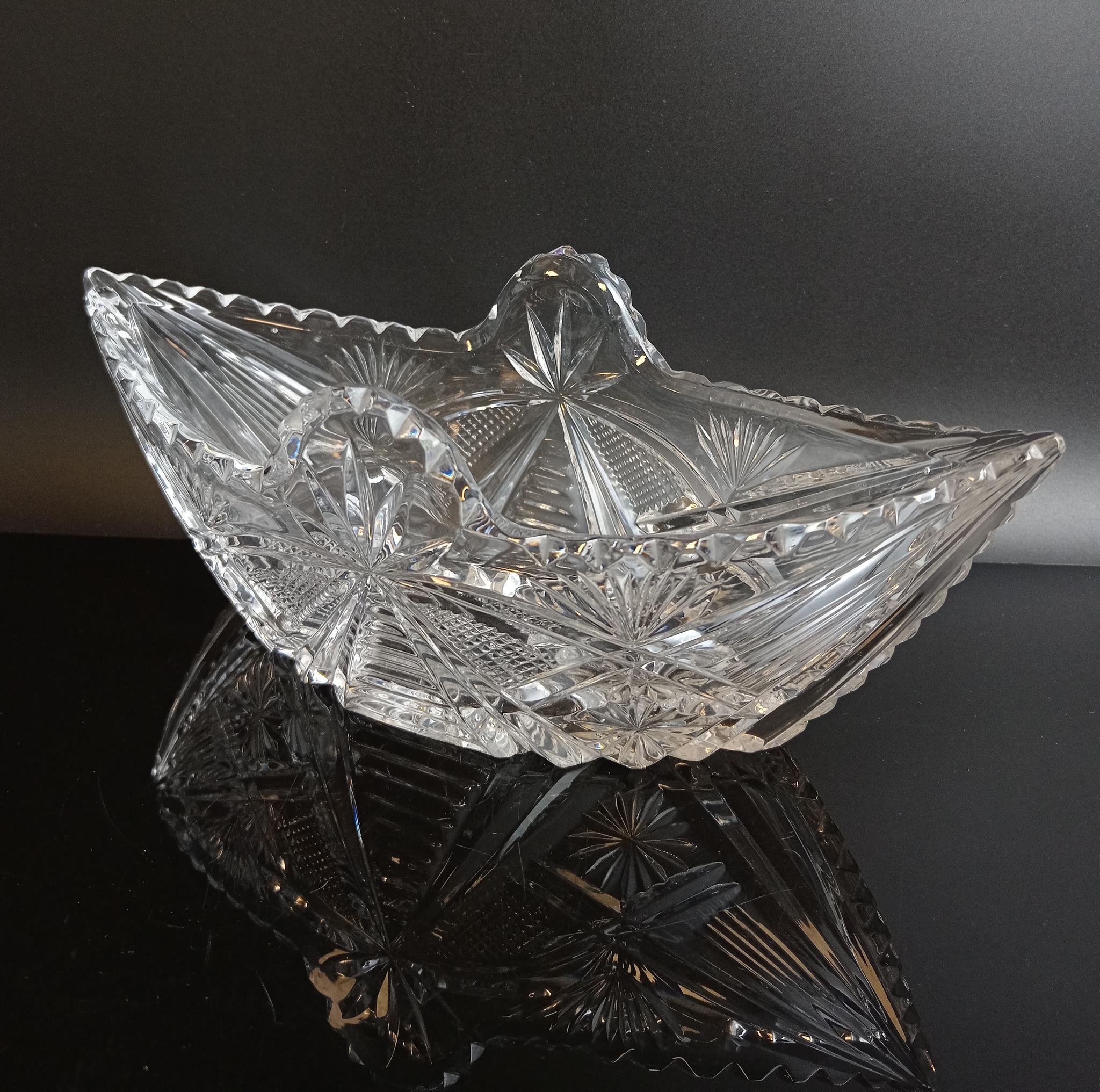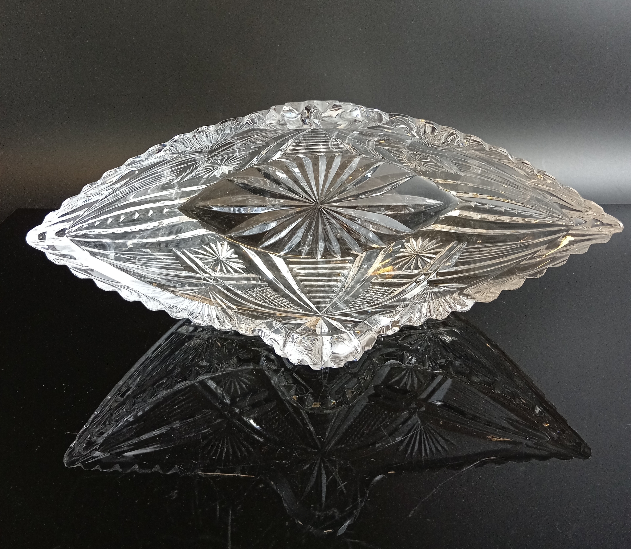 Салатник Ладья хрусталь, алмазная грань, геометрический орнамент, винтаж СССР 1970-1990 гг. Длина - 24 см, высота - 9 см. Присутствуют следы использования- состояние на фото