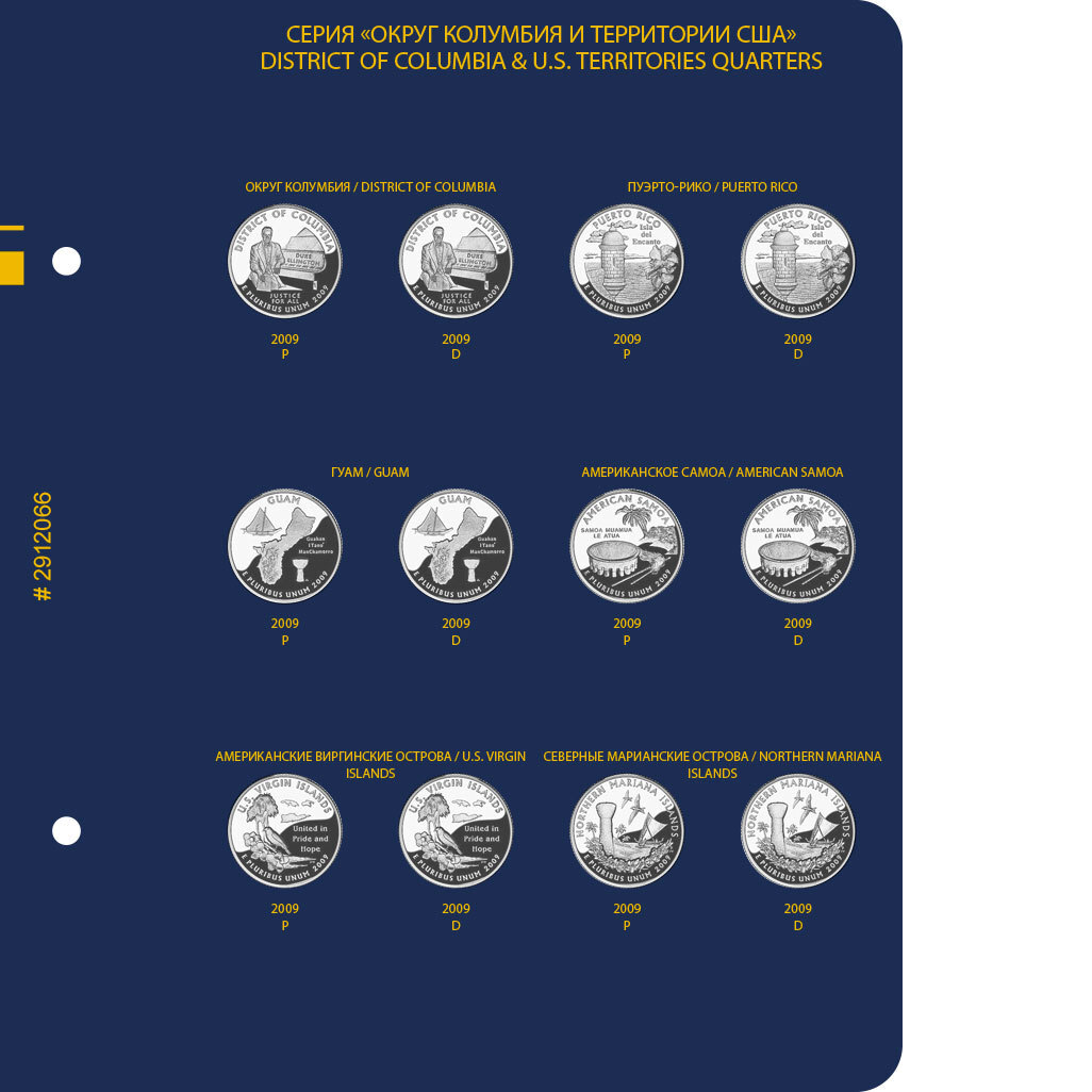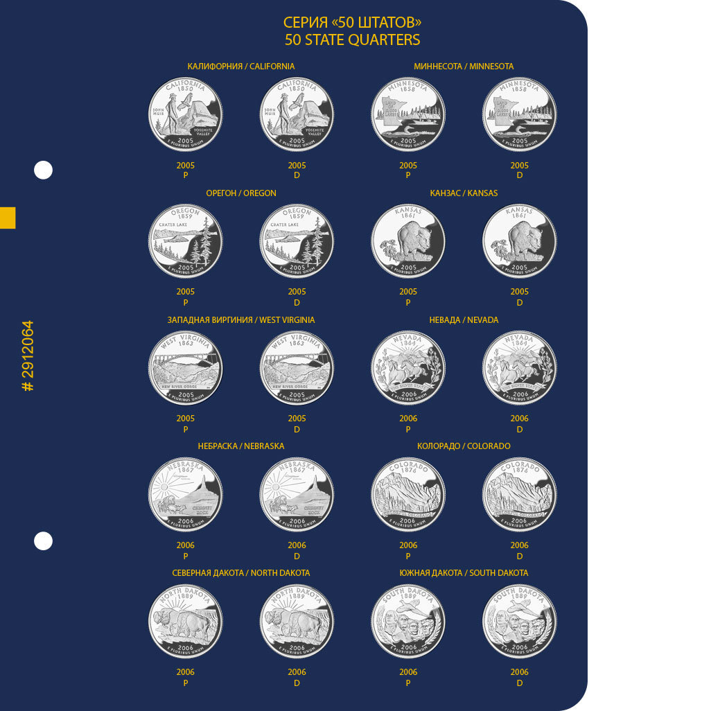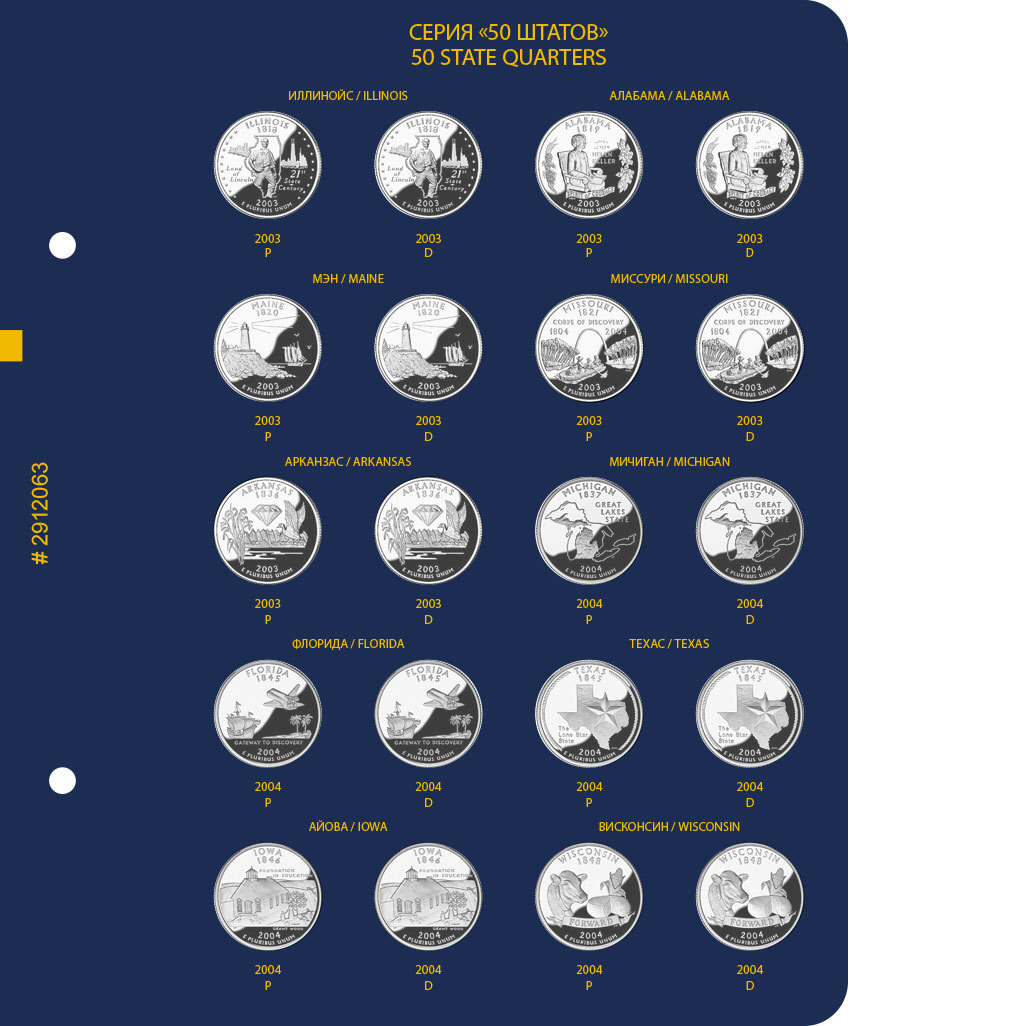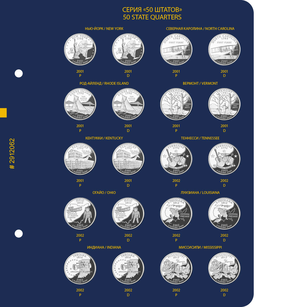 Альбом предназначен для коллекционирования монет достоинством 25 центов США серии «50 штатов», выпускавшихся с 1999 по 2008 год и монет серии «Округ Колумбия и территории США», выпущенных в 2009 году.