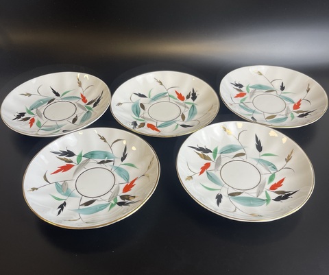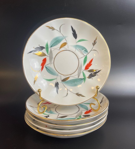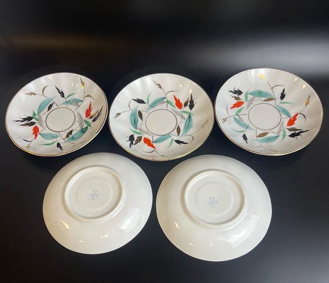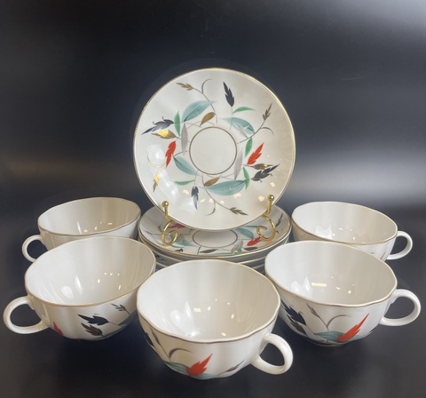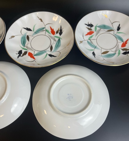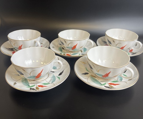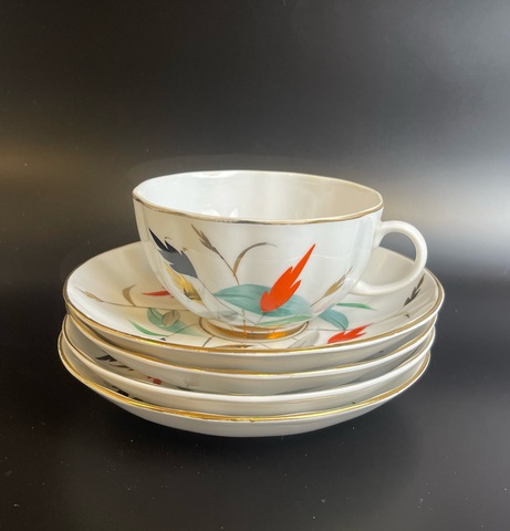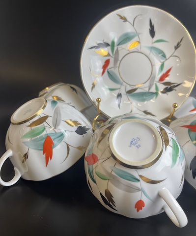 Сервиз чайный : На лугу на 5 персон - 5 чайных пар ,10 предметов , автор росписи Л.К. Блак, фарфор, роспись, золочение, Ленинградский фарфоровый завод (ЛФЗ), СССР, 1960-1980 гг. В комплект входят 5 чайных пар. Редкий набор. Сервантное хранение, незначительные следы использования.
