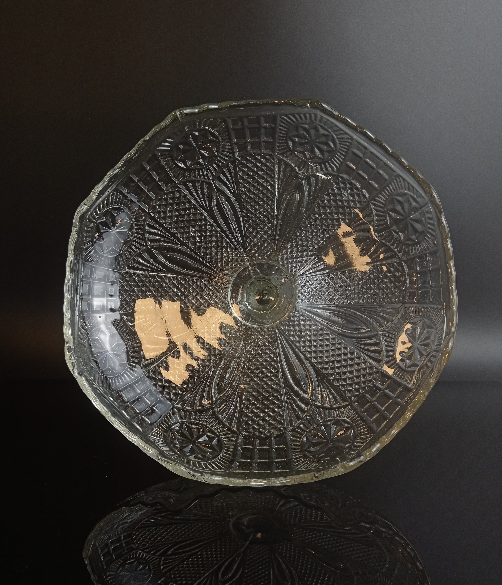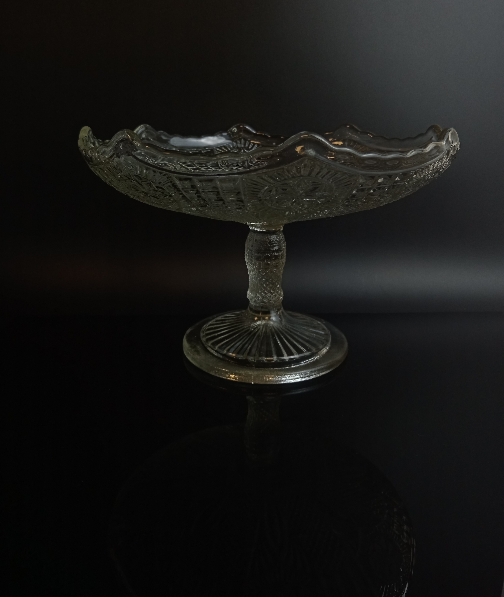 Шикарная ваза Царская фруктовница на изящной ножке из толстого прессованного стекла, завод Братьев Краевских, Царская Россия до 1917 года. Ваза представлена в каталоге до 1917 года ( 596 в каталоге).