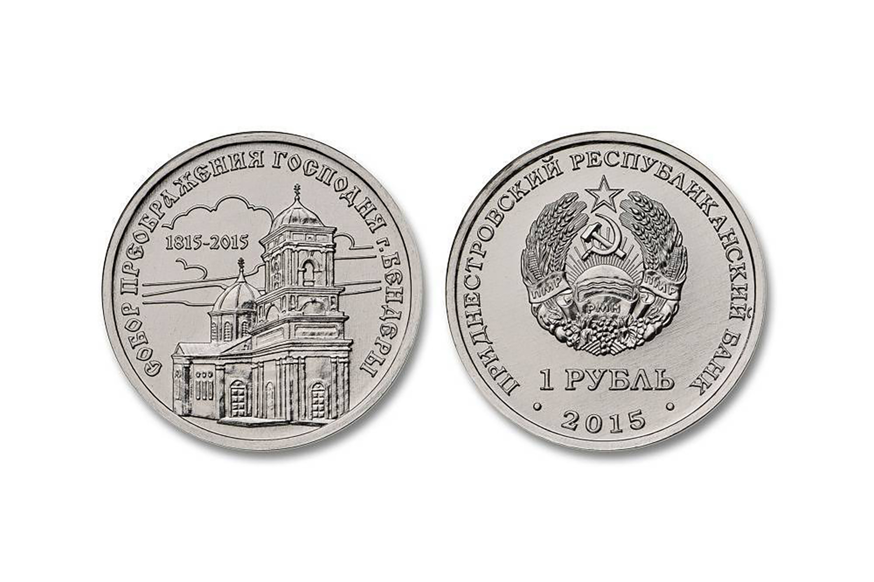 Монета Приднестровья 1 рубль 2015 года выпуска посвящена 200-летию действующего Собора Преображения Господня в городе Бендеры. На монете изображение Собора и памятная дата - 1815-2015, на оборотной стороне знаки государственности Приднестровья, а так же номинал, год выпуска и надпись "ПРИДНЕСТРОВСКИЙ РЕСПУБЛИКАНСКИЙ БАНК".