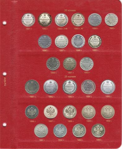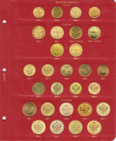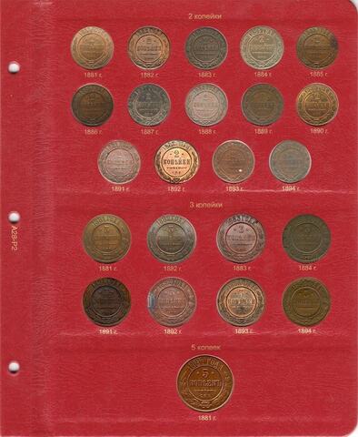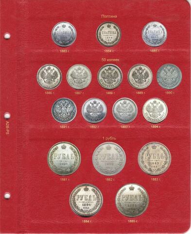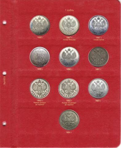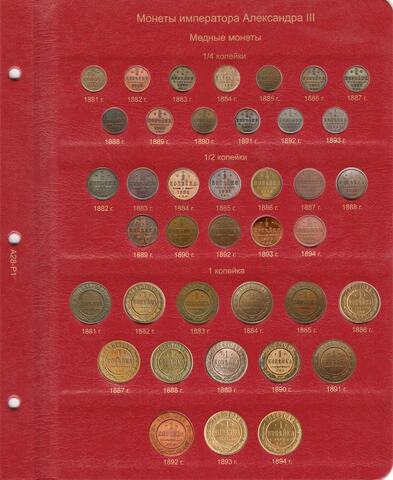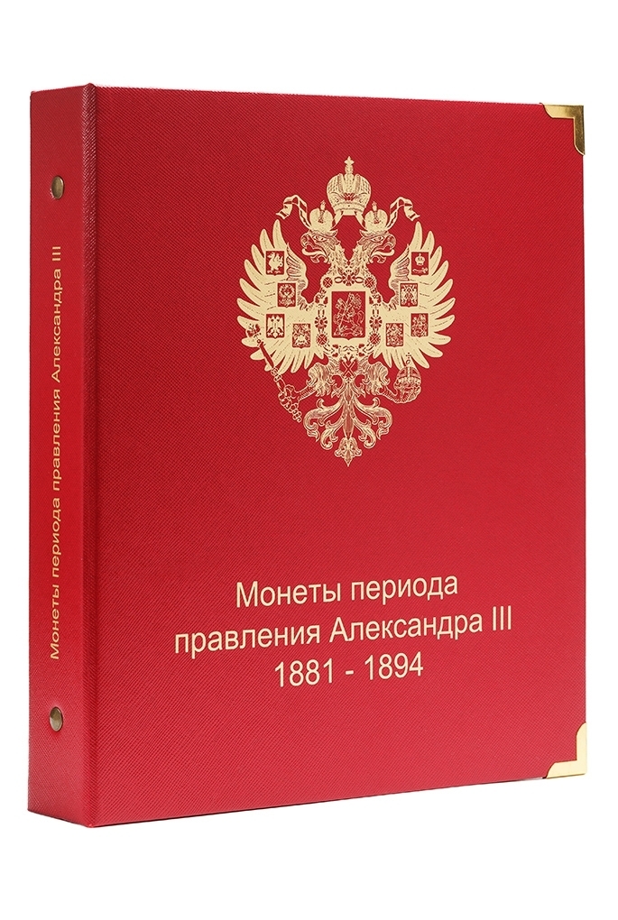 Альбом для медных, серебряных и золотых монет императора Александра III. В новый альбом включили всю погодовку монет этого императора, начиная от полушек "старого образца", заканчивая новым типом серебряного рубля с портретом императора. До этого момента с 1796 года не выпускали монеты с изображением царствующей особы.