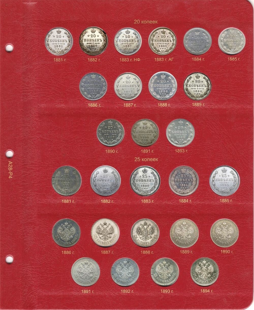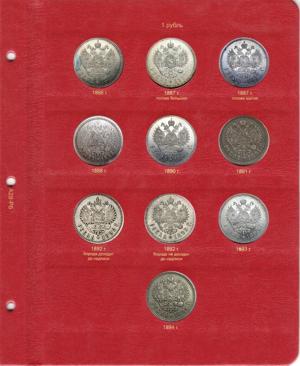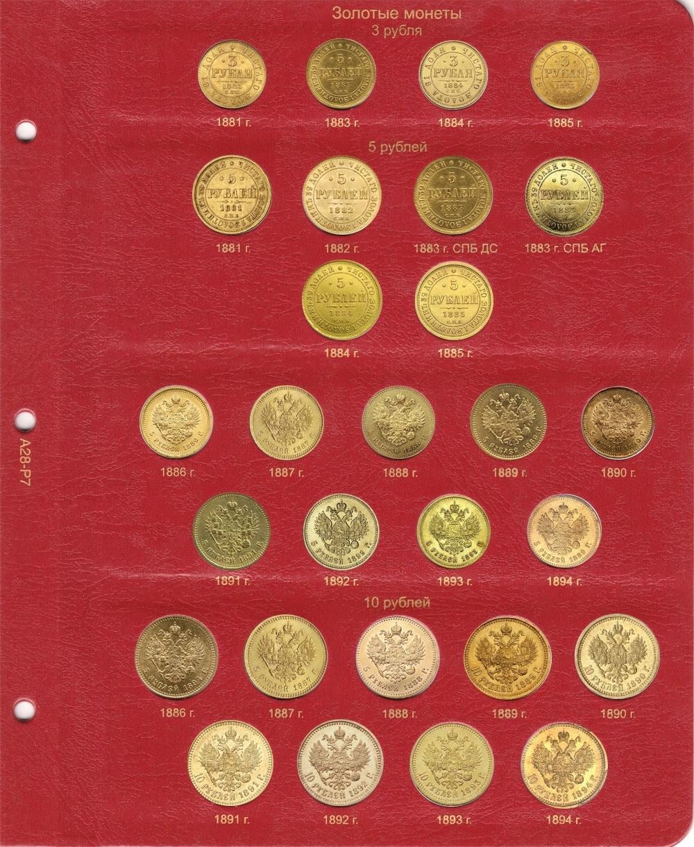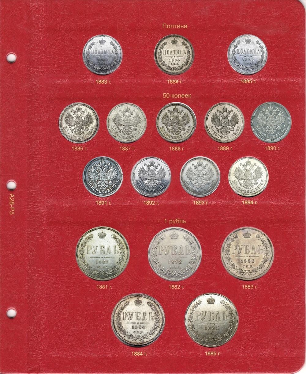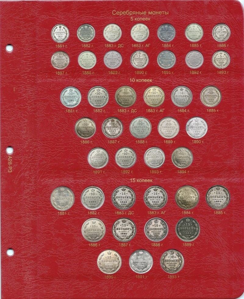 В альбоме для монет Александра III выпускались серебряные монеты номиналом: 5, 10, 15, 20, 25, 50 копеек и 1 рубль. Золотые монеты выходили: 3, 5 и 10 рублей. В 1885 г. была предпринята ревизия Монетного двора для их усовершенствования. Данные монеты представляют огромную ценность для нумизматов.