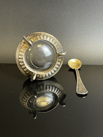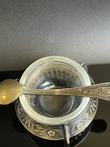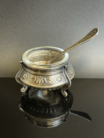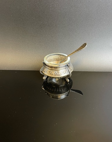 Солонка с ложкой, растительный орнамент, клеймо, стекло, мельхиор, винтаж СССР 1970-1990 гг. Размеры : 5.5х5.5х3.5 см. Чуть погнута снизу- состояние на фото