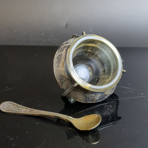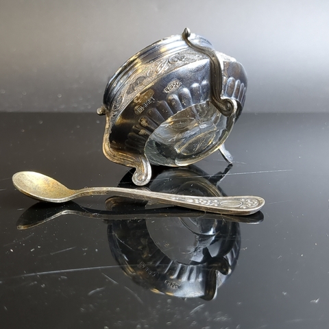 Солонка с растительным орнаментом и ложкой, мельхиор (медь-никель), стекло, Мстерская художественная фабрика «Ювелир», СССР, 1975 г.