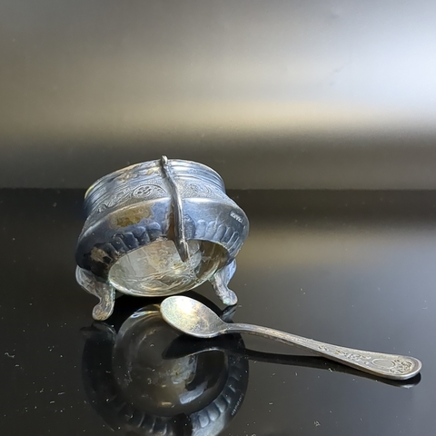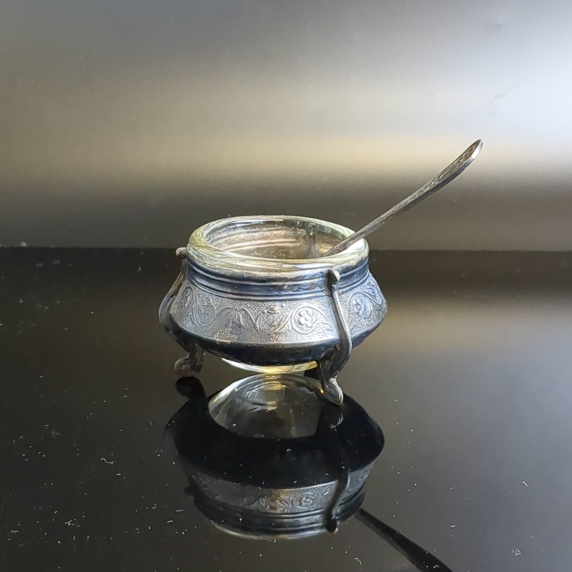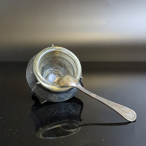 Солонка с растительным орнаментом и ложкой, мельхиор (медь-никель), стекло, Мстерская художественная фабрика «Ювелир», СССР, 1975 г.