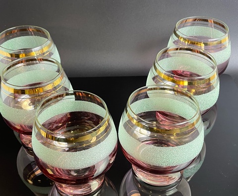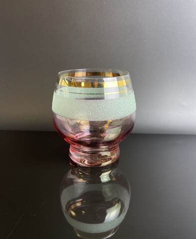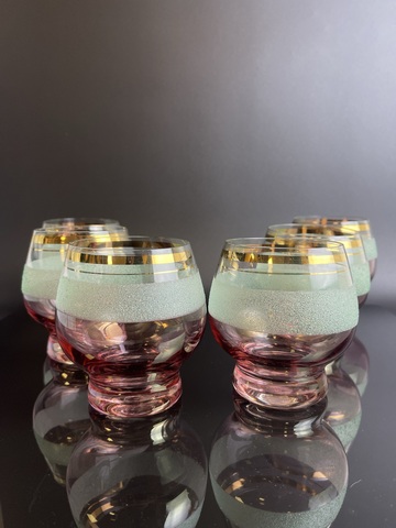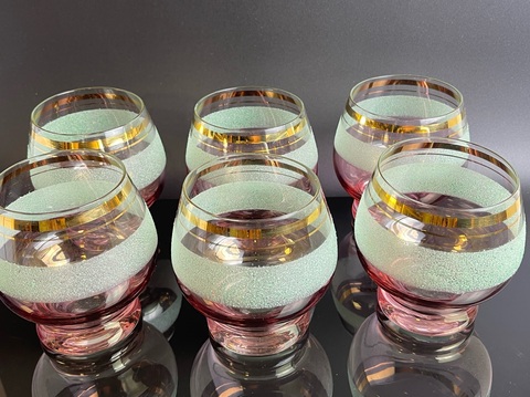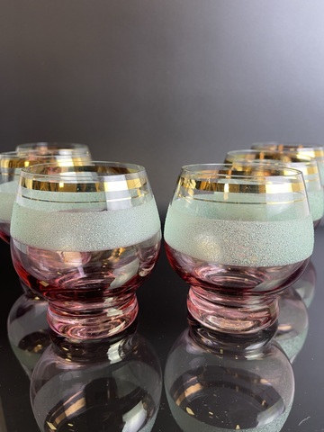 Стаканы - бочки стекло набор из 6 штук, насыпное зеленое стекло и золочение, винтаж, редкие, СССР 1970-1990 гг. Высота - 9.5 см, диаметр горлышка - 7 см. Сервантное хранение - незначительные следы использования, состояние на фото
