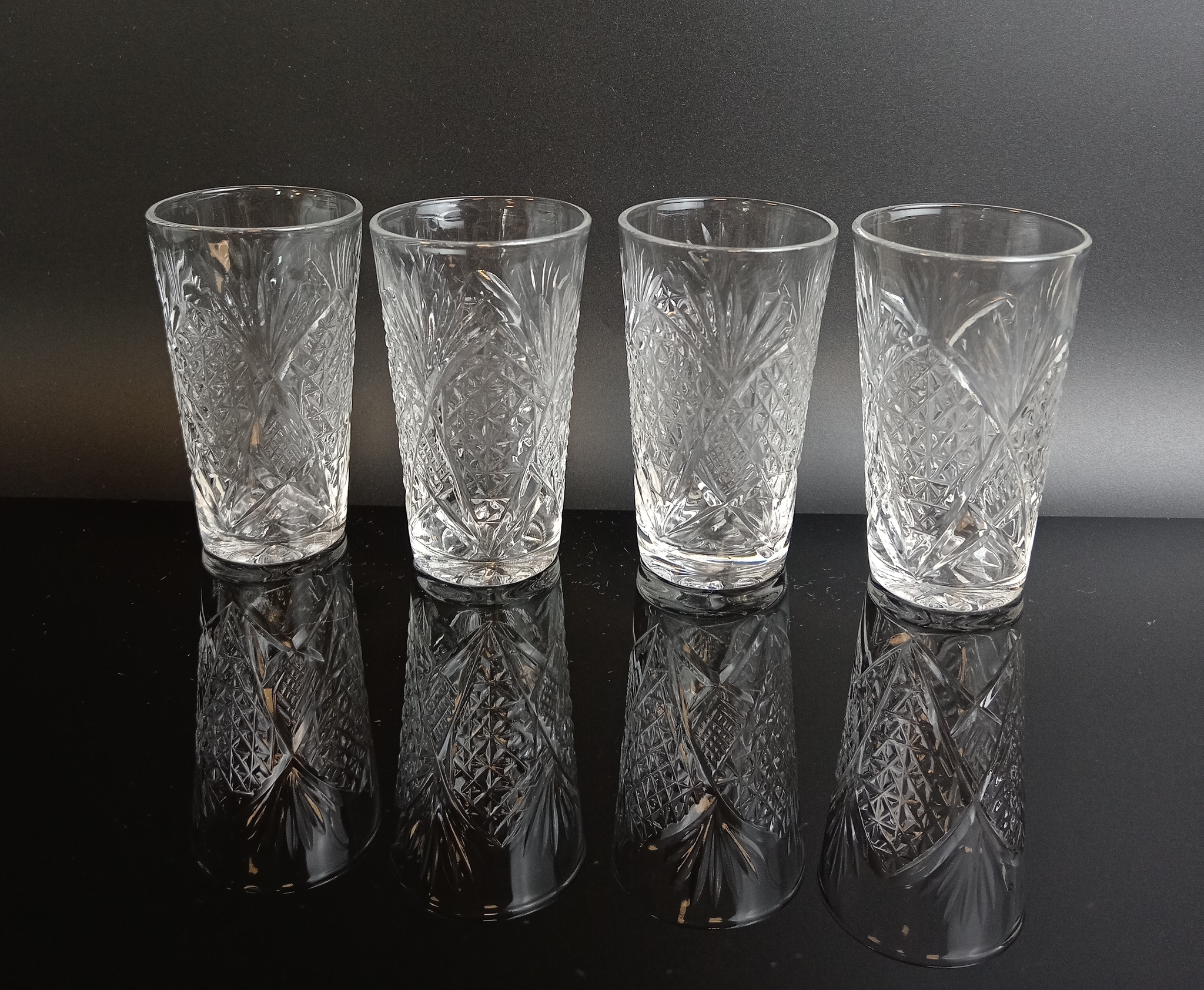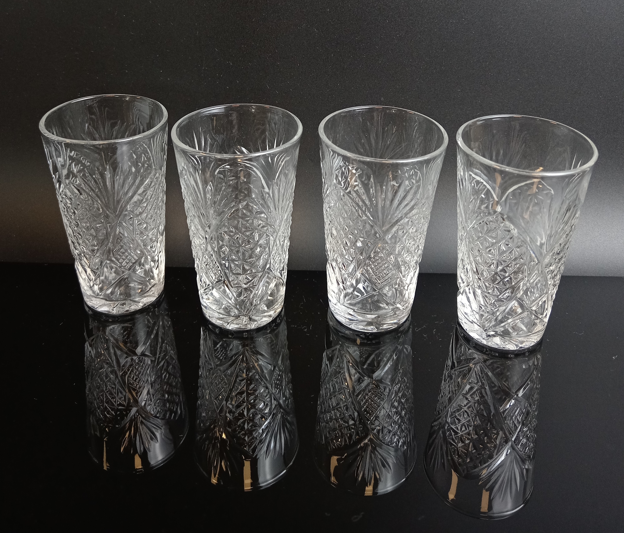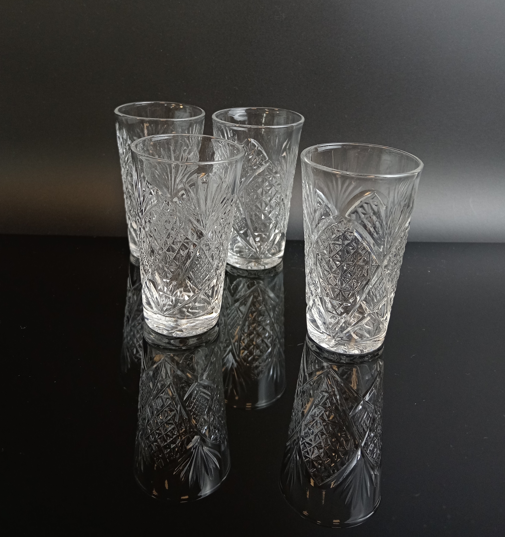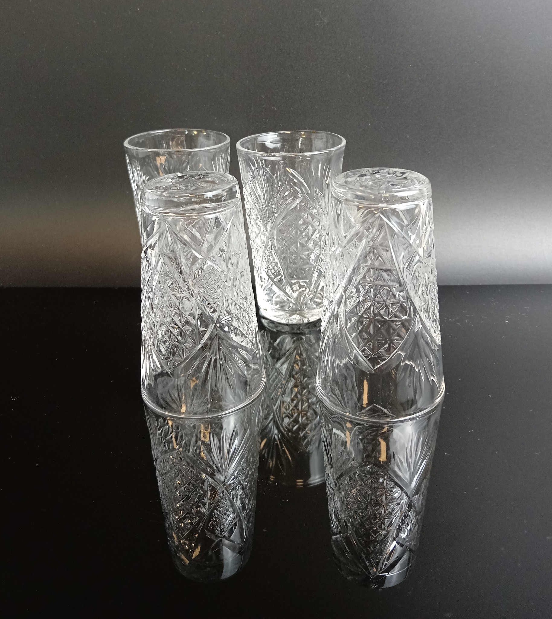 Стаканы хрустальные набор из 4 штук алмазная грань, геометрический и растительный орнамент,100 мл., винтаж СССР 1970-1990 гг. Высота - 8.5 см. Присутствуют следы использования - состояние на фото
