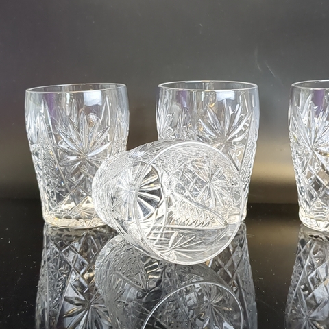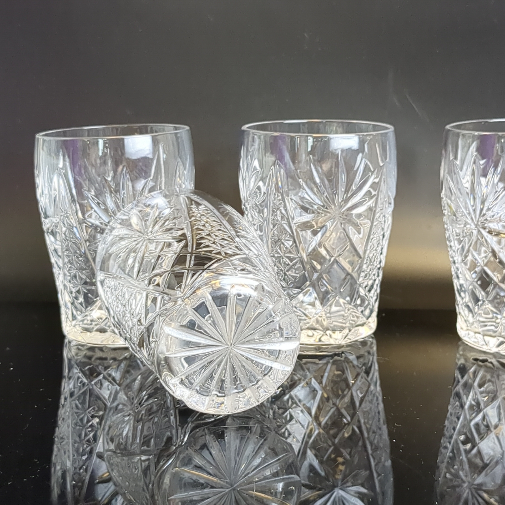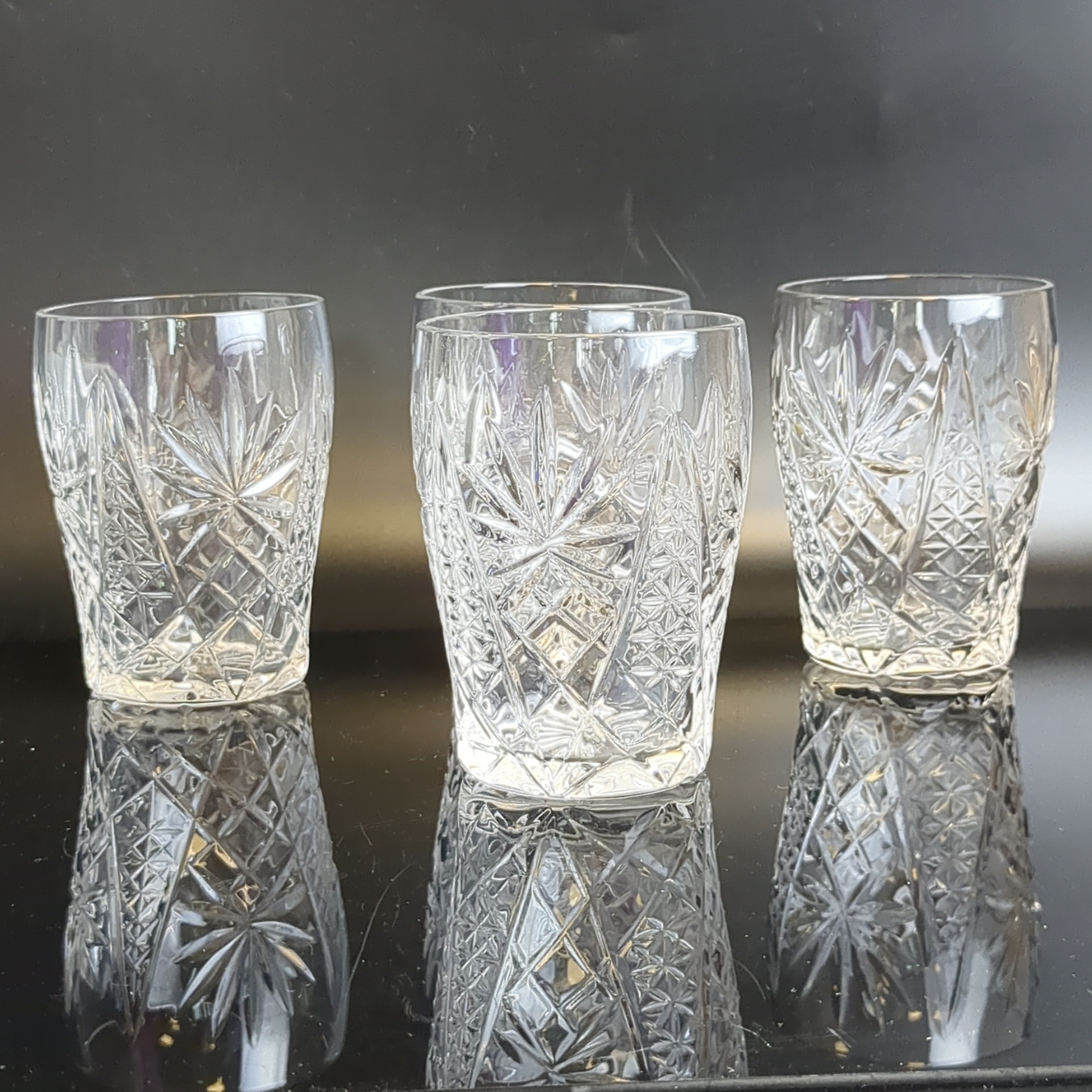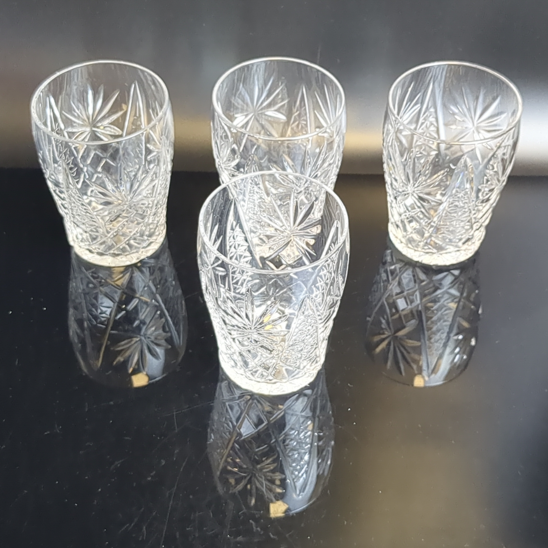 Стаканы хрустальные набор из 4 штук, алмазная грань, геометрический орнамент, высота -10 см, (объём-? мл), винтаж СССР 1970-1990 гг. Состояние и комплектация на фото
