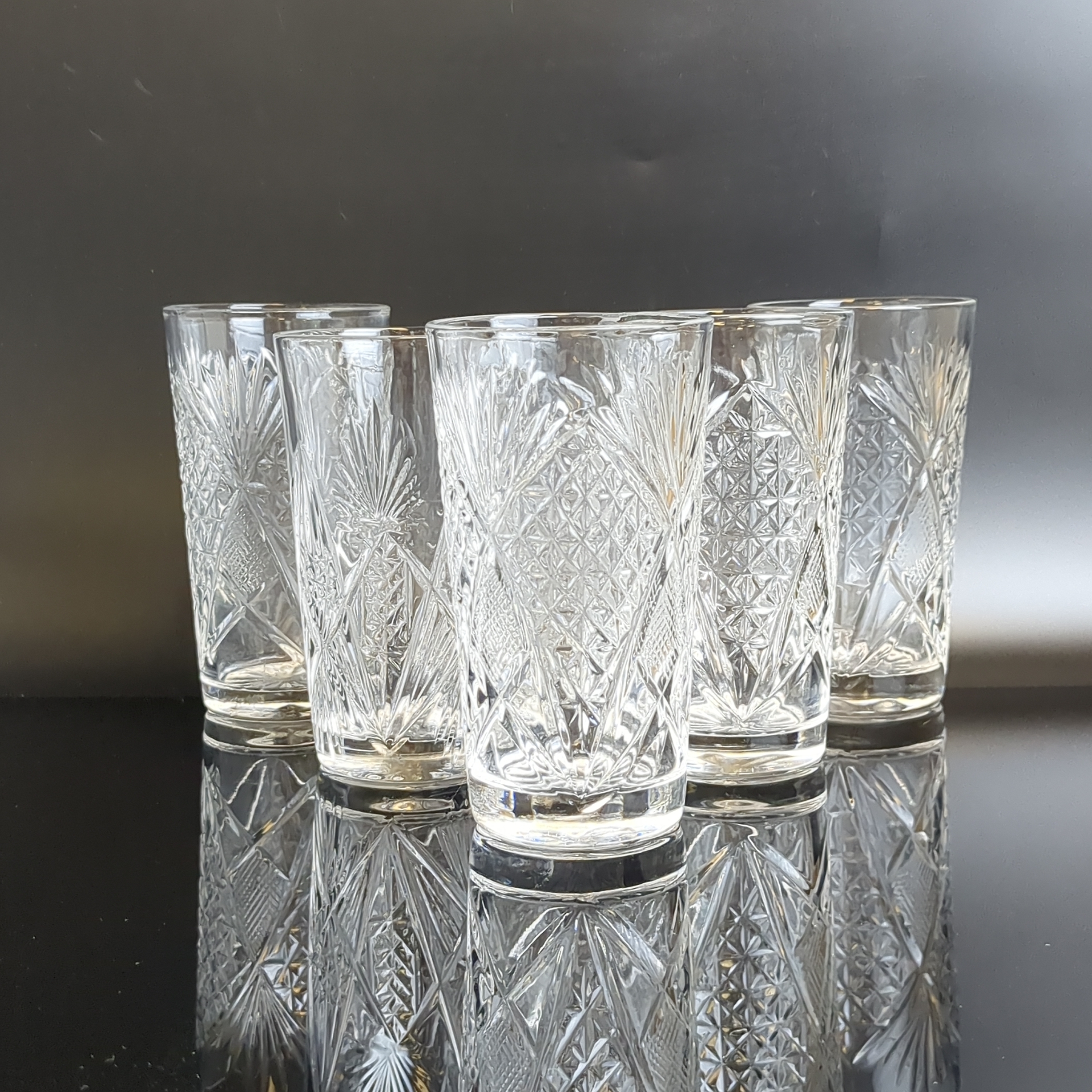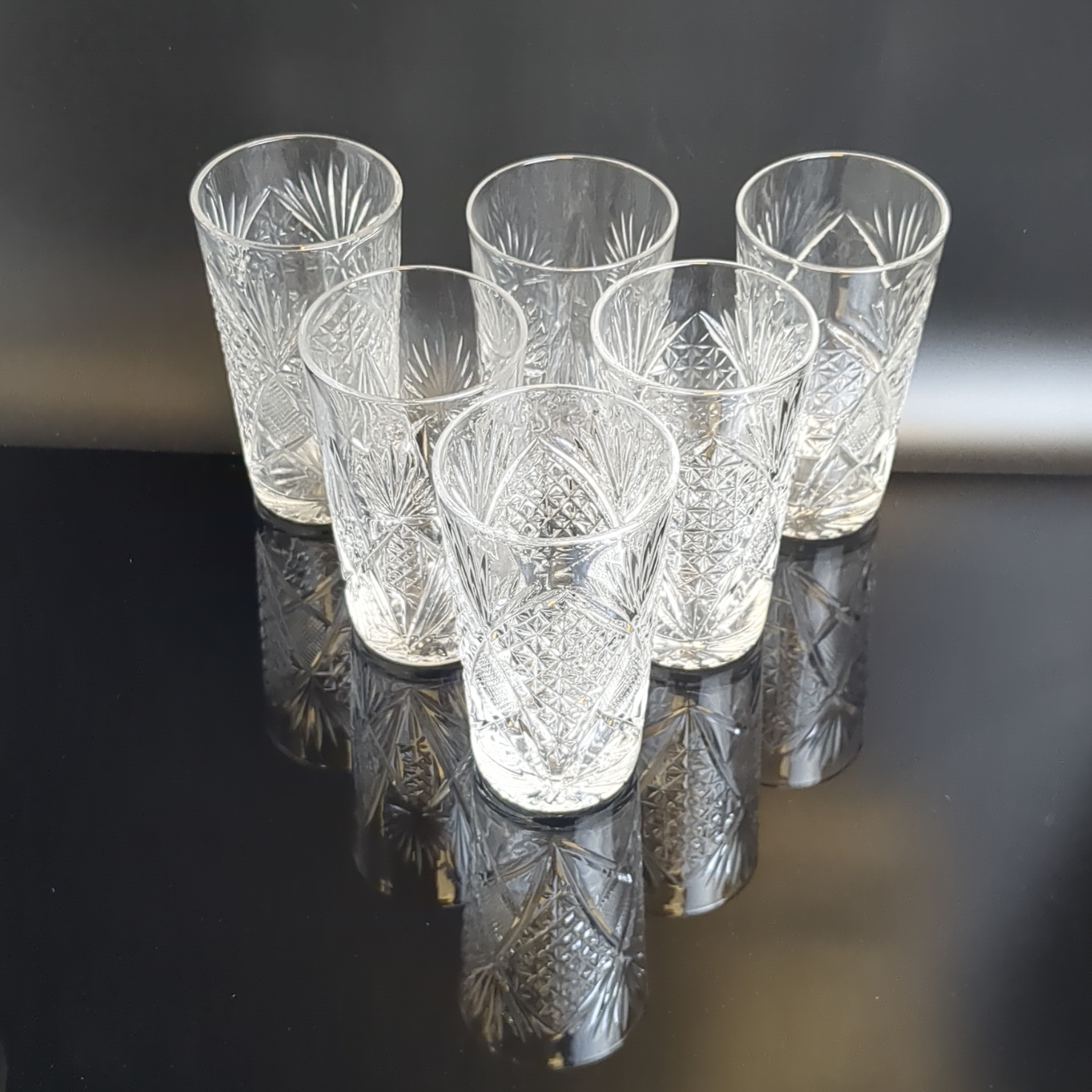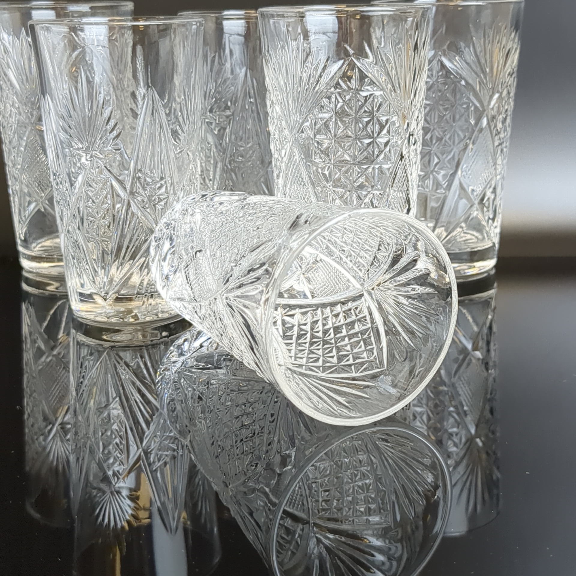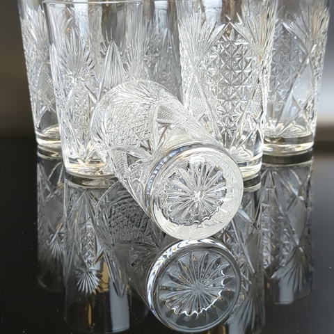 Стаканы хрустальные набор из 6 штук, алмазная грань, геометрический орнамент, высота -12 см, (объём -? мл), винтаж СССР 1970-1990 гг. Состояние и комплектация на фото