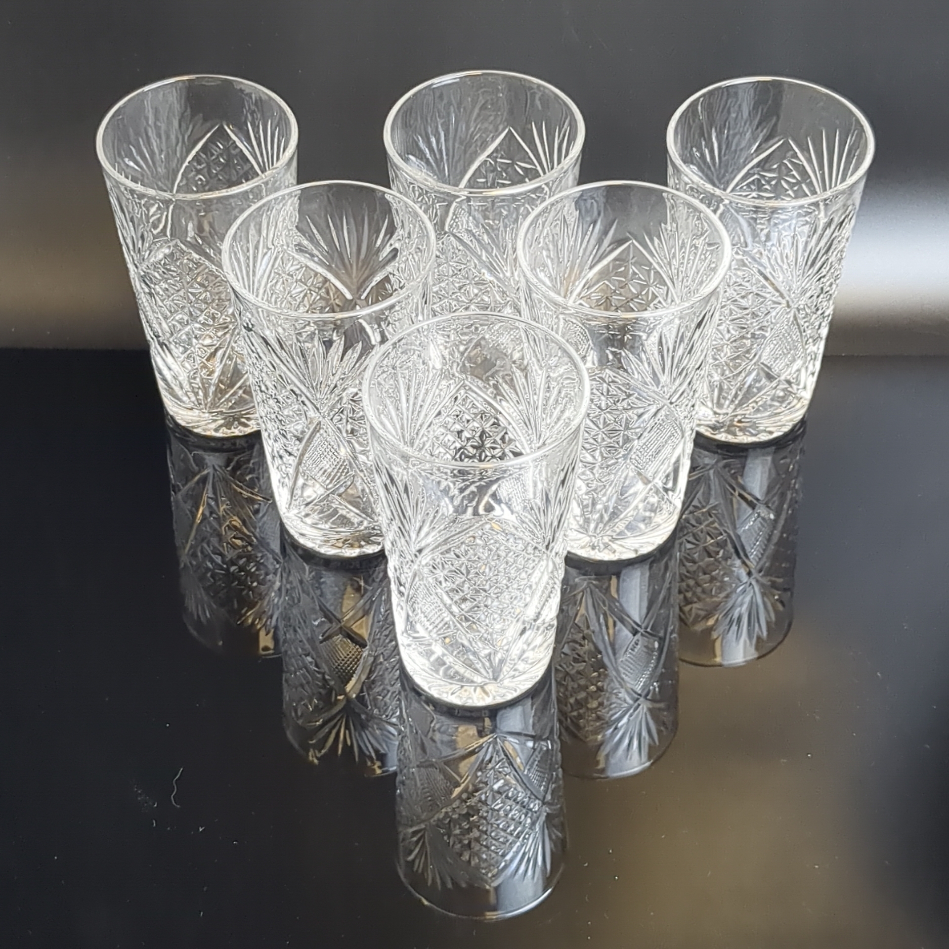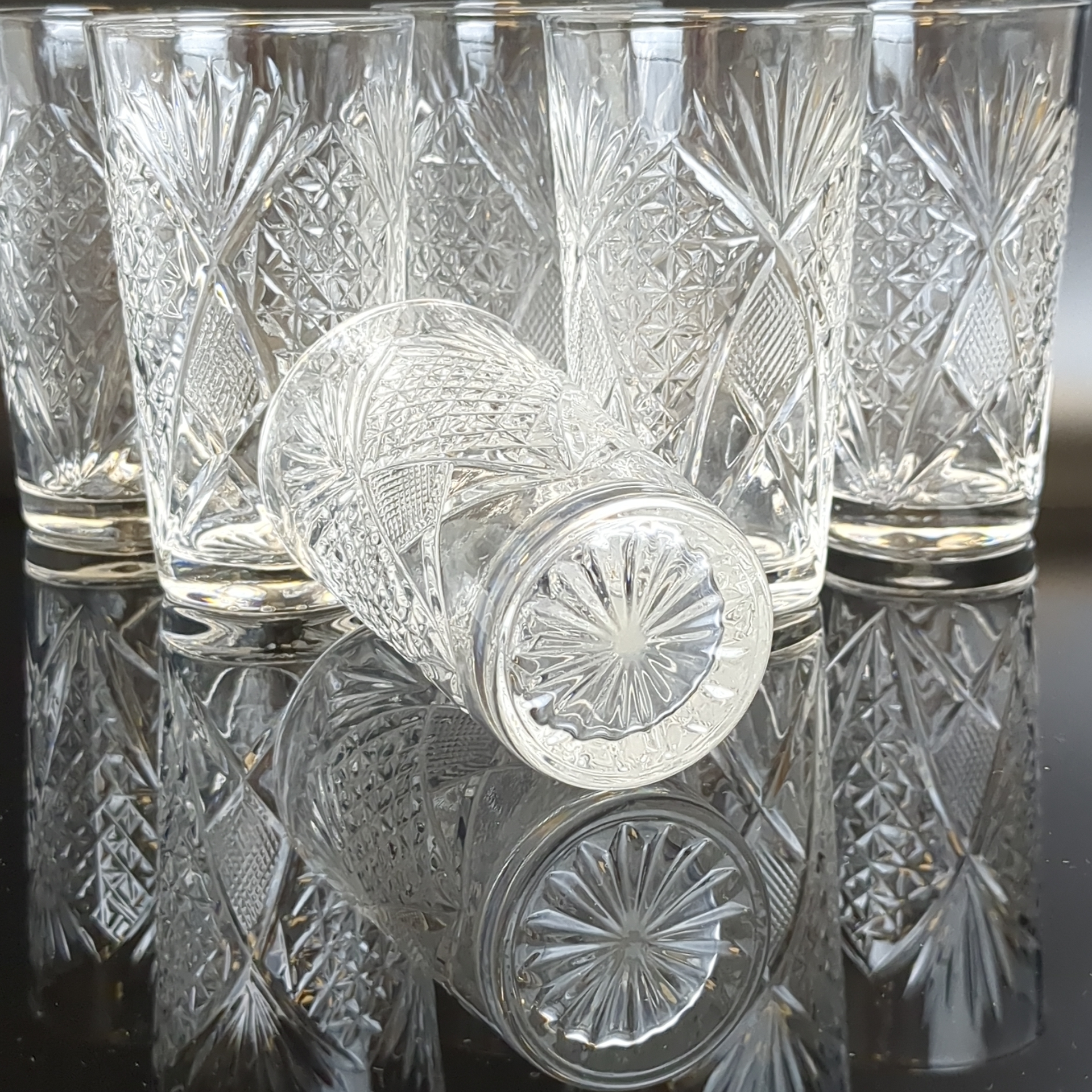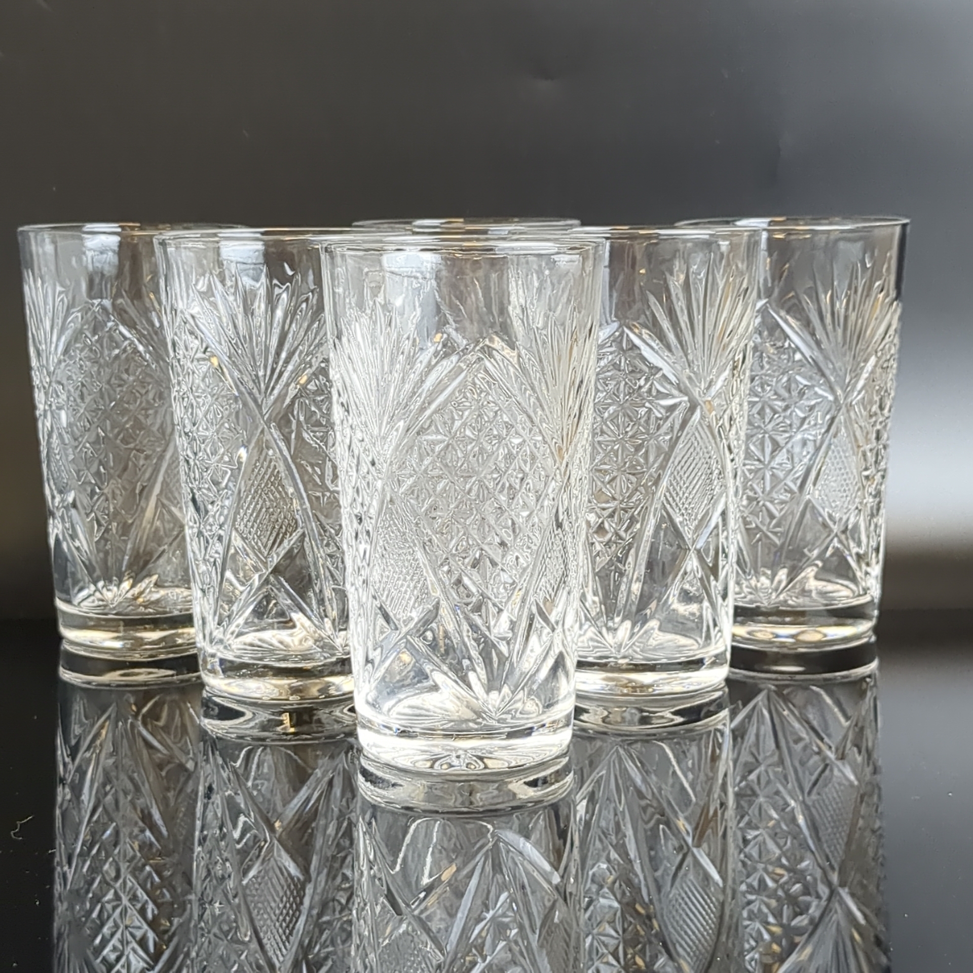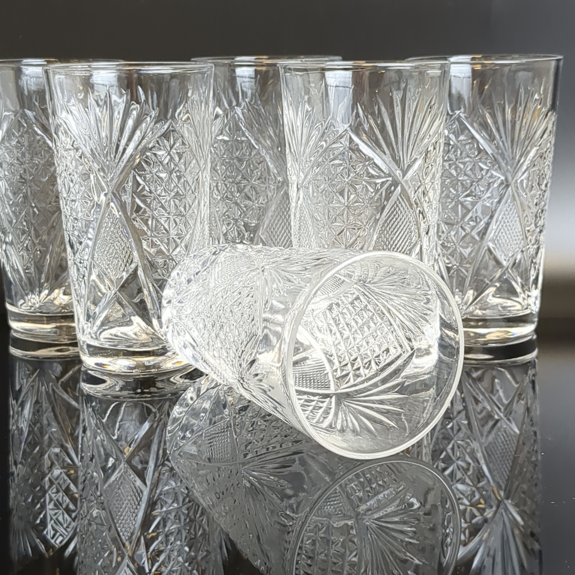 Стаканы хрустальные набор из 6 штук, алмазная грань, геометрический орнамент, высота -13 см, (объём -? мл), винтаж СССР 1970-1990 гг. Состояние и комплектация на фото