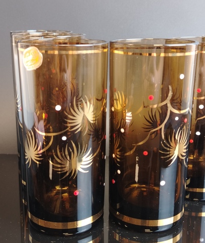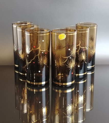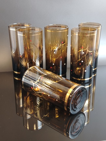 Стаканы набор из 6 штук 250 мл, Богемия, Чехословакия, для воды и прохладительных напитков с растительным декором на 6 персон, Bohemia, цветное стекло, золочение, винтаж 1970-1990 гг. Изящные ретро стаканы, на одном стакане этикетка Bohemia.
