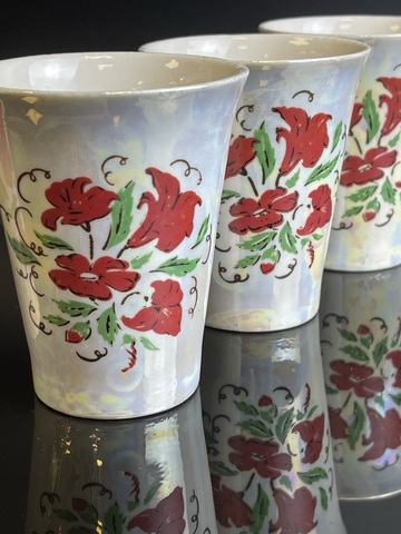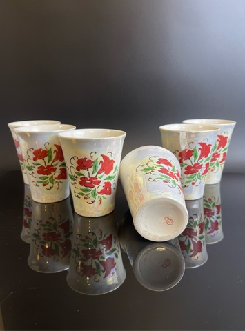 Стаканы набор из 6 штук с цветочным рисунком, фарфор, перламутр, Горьковский ордена Трудового Красного Знамени завод "Орбита", СССР, 1970-1980 гг. Высота стакана - 8.6 см, диаметр верха - 7.2 см. Объем - 150 мл. Присутствует следы использования - состояние на фото.