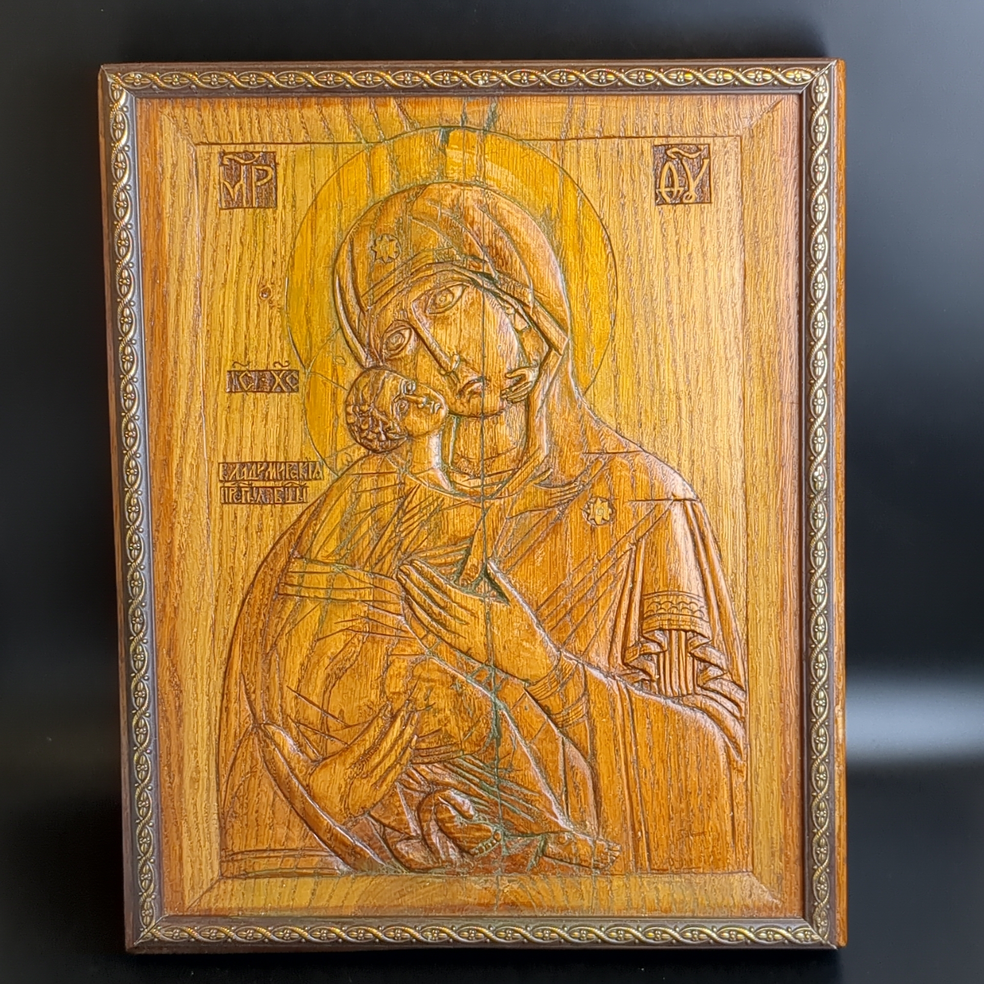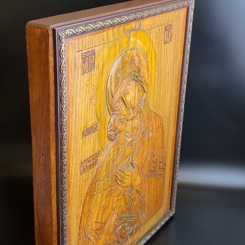 Старинная резная икона "Богоматерь Владимирская. Размер иконы 42,5 х 34 х 3,5 см.. Резьба по дереву выполнена вручную в 1980-е гг. СССР. Ручная работа. Автор данной работы Салангин Николай Васильвич - художник - иконописец Вятского края, мастер своего дела. Его работы так же находятся в некоторых храмах. Доска дуба подобрана таким образом, чтобы кольца располагались в разные стороны, чтобы доска не изгибалась со временем. Резная икона из дерева изготовленна по православным канонам. Владимирская икона Божьей Матери исцеляет от болезней, помогает справиться с трудностями в жизни, покровительствует матерям и детям. Так же, Пресвятая Владимирская Богородица исцеляет от бесплодия и заболевания детородных органов. Дни празднования иконе Богоматери Владимирской : 3 июня, 23 июля и 8 сентября по новому стилю. Первообраз чудотворной иконы Богородицы попал на Русь из Византии в начале 12-го века: это был дорогой подарок русскому князю Мстиславу от самого Константинопольского патриарха Луки Хрисоверга. Сын Юрия Долгорукого, князь Андрей Боголюбский переместил древнюю намоленную икону из Вышгорода во Владимир, отчего Богородичный образ и получил нынешнее название. Во Владимире ценная икона хранилась в Успенском соборе, а ныне святой чудотворный образ Владимирской Божией Матери находится в Москве, в Третьяковской галерее. Резные деревянные иконы ценятся за свою красоту, духовную силу и уникальность. Резьба по дереву придает иконе особую выразительность и изысканность, а энергетика дерева в сочетании с художественным замыслом делает ее источником положительных эмоций и умиротворения. По иконе идет трещина, из за этого цена снижена на такой большой размер