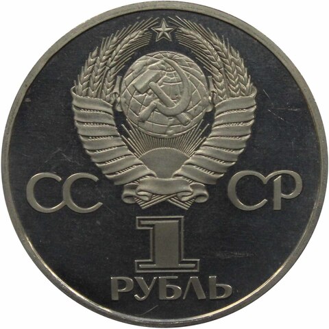 Аверс: сверху герб СССР с 15 витками ленты, слева от него буквы «СС», справа «СР», ниже обозначение достоинства монеты цифра «1» и ниже слово «РУБЛЬ».