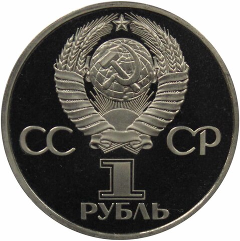 Аверс: сверху герб СССР с 15 витками ленты, слева от него буквы «СС», справа «СР», ниже обозначение достоинства монеты цифра «1» и ниже слово «РУБЛЬ».