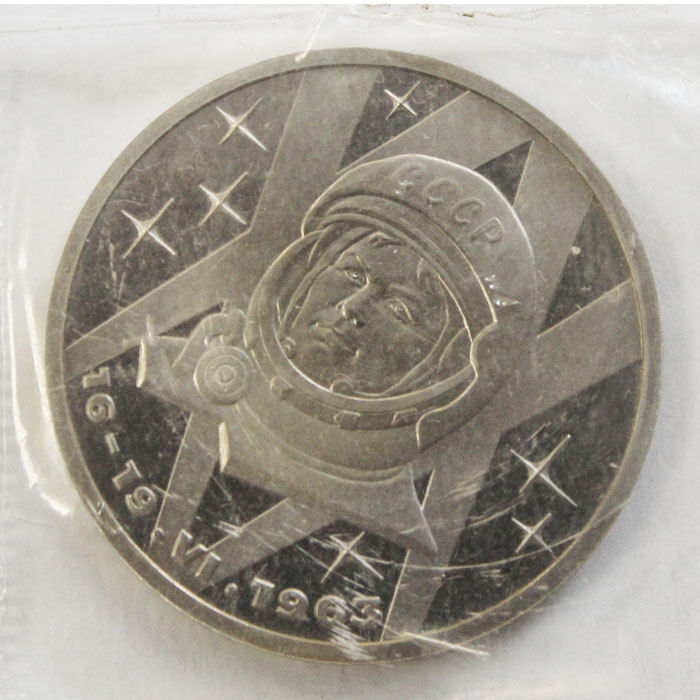 Реверс: На фоне звездного неба и цифры «XX» изображение первой женщины-космонавта - гражданки СССР В. В. Терешковой в скафандре и внизу полукругом даты «16-19.VI. 1963».