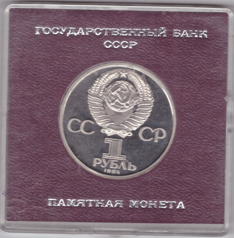 Аверс: Сверху герб СССР с 15 витками ленты, слева от него буквы «СС», справа «СР», ниже обозначение достоинства монеты цифра «1» и ниже слово «РУБЛЬ», внизу у канта год выпуска монеты «1984».