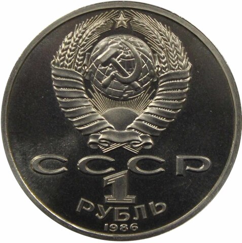Аверс: сверху герб СССР с 15 витками ленты, под ним буквы «СССР», ниже обозначение достоинства монеты цифра «1» и ниже слово «РУБЛЬ», внизу у канта год выпуска монеты «1986».