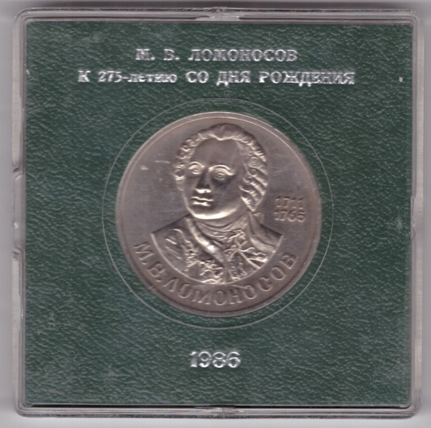 Реверс: В центре изображение М. В. Ломоносова и справа от него в две строки даты «1711» и «1765», в нижней части полукругом надпись «М. В. ЛОМОНОСОВ».
