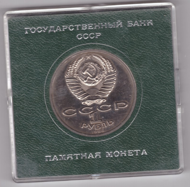 Аверс: Сверху герб СССР с 15 витками ленты, под ним буквы «СССР», ниже обозначение достоинства монеты цифра «1» и ниже слово «РУБЛЬ», внизу у канта год выпуска монеты «1986».