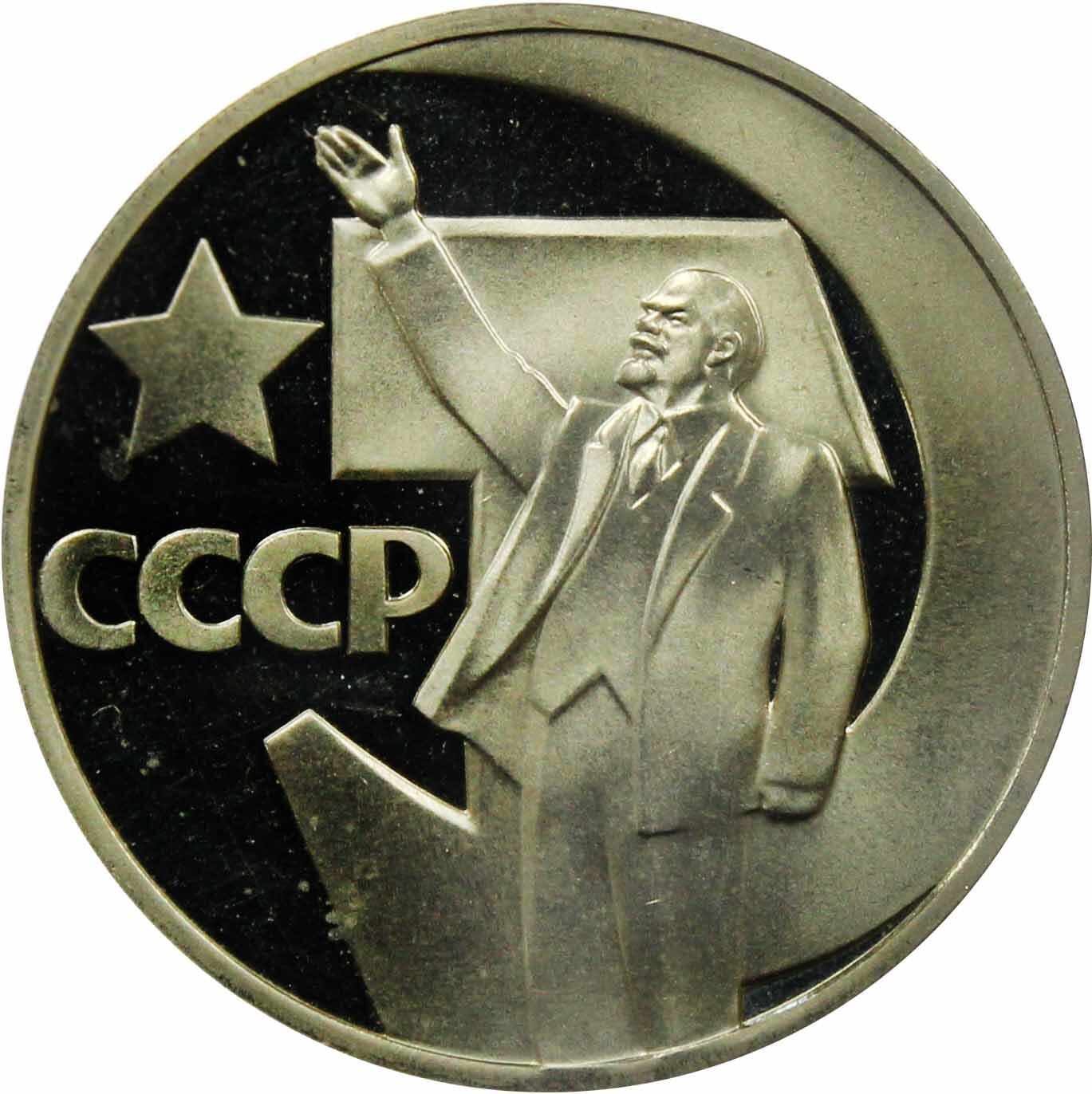 Реверс: слева пятиконечная звезда, под ней буквы «СССР», справа на В.И. Ленин с поднятой правой рукой, за ним занимающее большую часть монетного поля изображение серпа и молота.