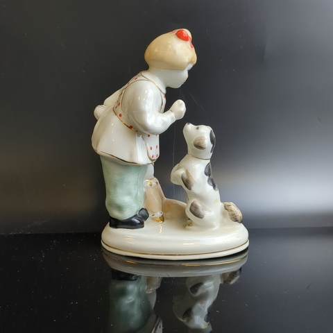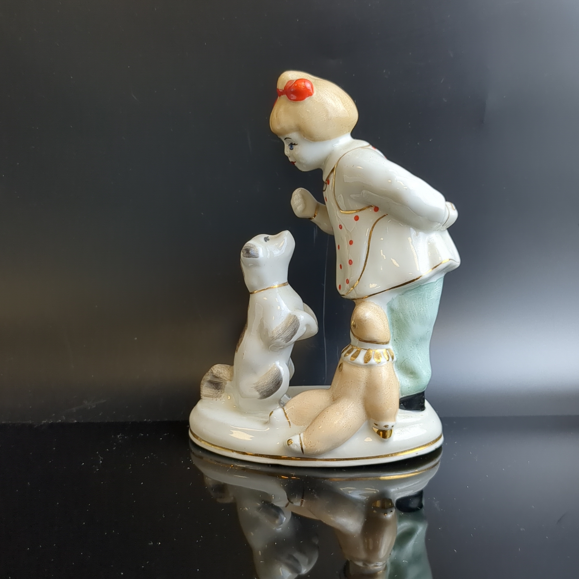 Статуэтка "А ну-ка отними!" ("Девочка с собакой и игрушкой"), автор С. Голембовская (Болзан), фарфор, роспись, золочение, Полонский завод художественной керамики (Полонное ЗХК), СССР, 1956-1972 гг.